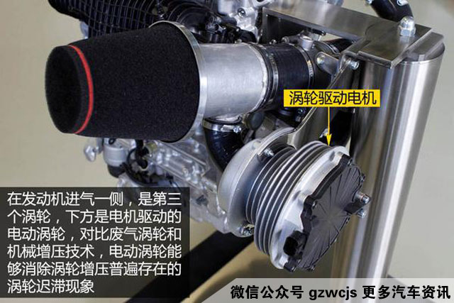 传统涡轮增压器由废气驱动,因此会存在一个因废气量不足以推动涡轮进入工作转速区间,从而导致涡轮增压器失效的状态,这就是涡轮迟滞。而即使是采用大小涡轮设计,也不能完全消除迟滞现象。而电动涡轮,则是通过由电机推动一个小型涡轮,在极低的转速就开始为发动机提供增压能力,到了高转速,电机停转,交由大涡轮负责增压,这么一来,就可以完全消除涡轮迟滞,让小排量涡轮发动机获得犹如大排量自然吸气发动机一般的顺畅加速感,算是现在比较完美的解决方案。