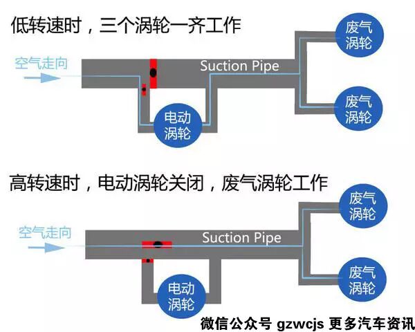 发动机处于低转速时,旁通阀将空气拦截而全部进入电子涡轮,此时发动机主要依靠电子涡轮来提供压缩空气;随着转速提升,废气涡轮开始介入工作,经过电子涡轮压缩的空气进入废气涡轮进行二次增压;转速继续升高,电子涡轮对于高速气流反而成了累赘,气流被旁通阀阻隔在电子涡轮之外,而沿着Suction Pipe流向已经进入状态的废气涡轮。这一套系统通过引入电子涡轮,解决大尺寸涡轮低速介入性不良的问题,而且在松油再加速的时候,也能快速启动弥补废气涡轮的涡轮迟滞。