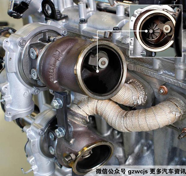 首先看传统涡轮部分,在发动机的排气侧,布置了上下两个并联的废气涡轮,而通过这个硕大的排气侧,也证明了这两个涡轮都属于高转出力型涡轮。那么涡轮迟滞岂不是十分严重?请往下看。