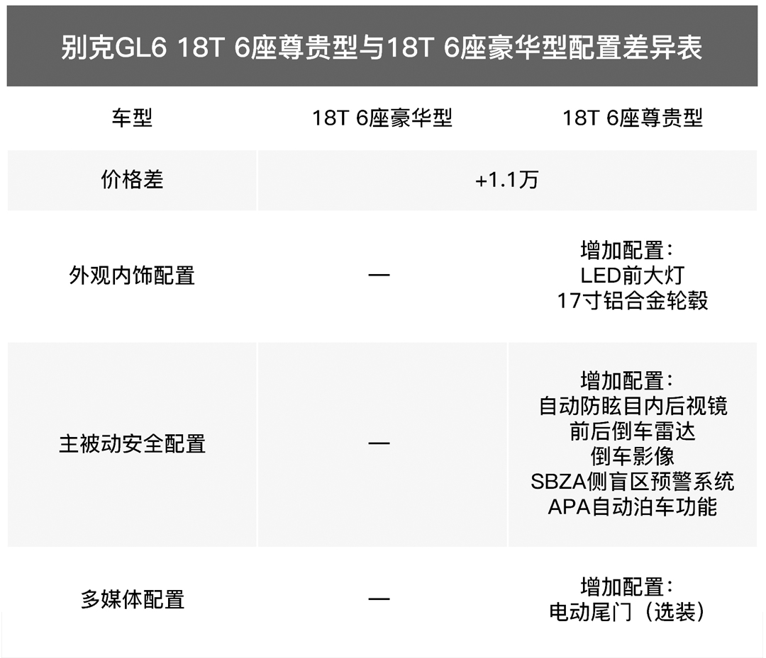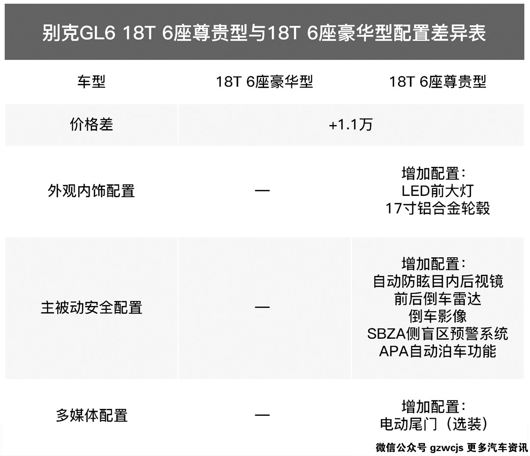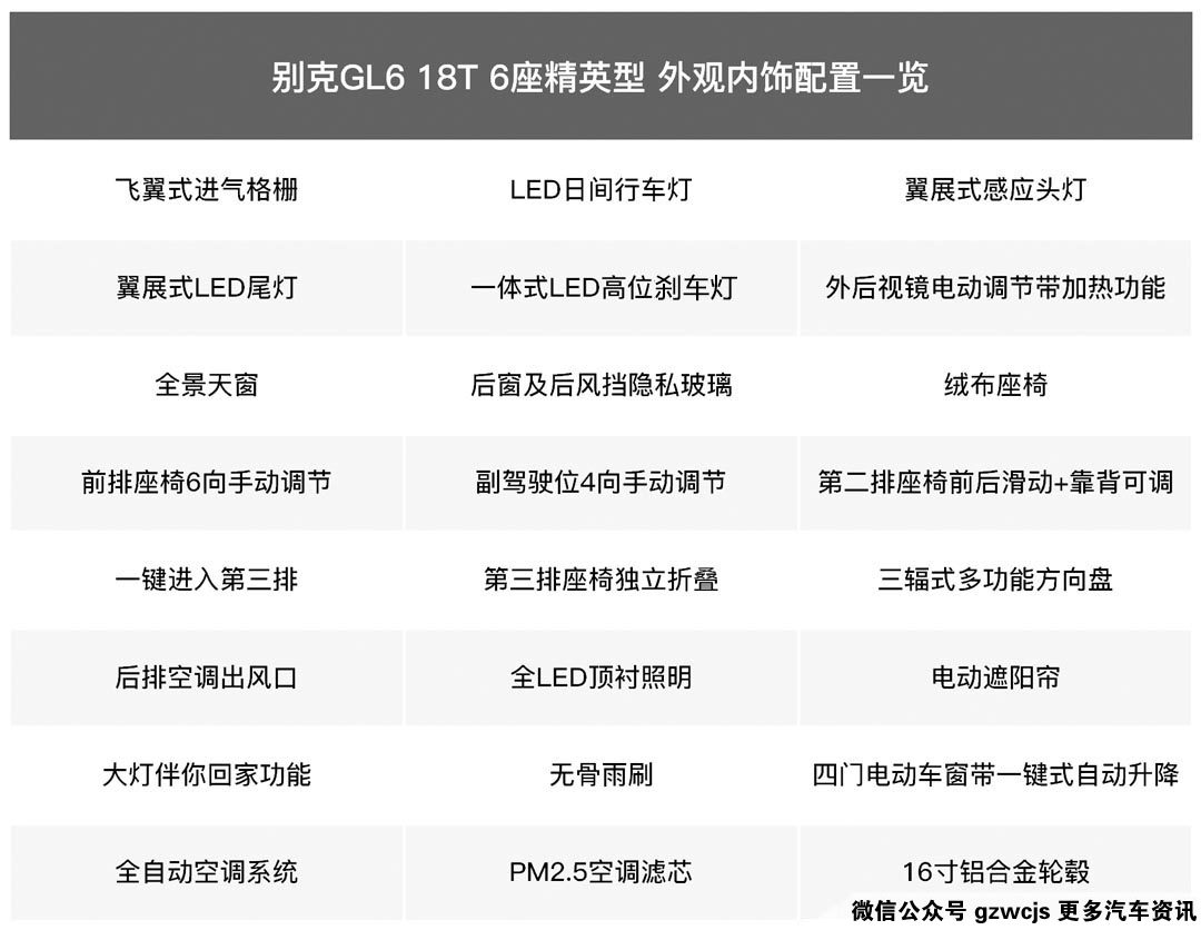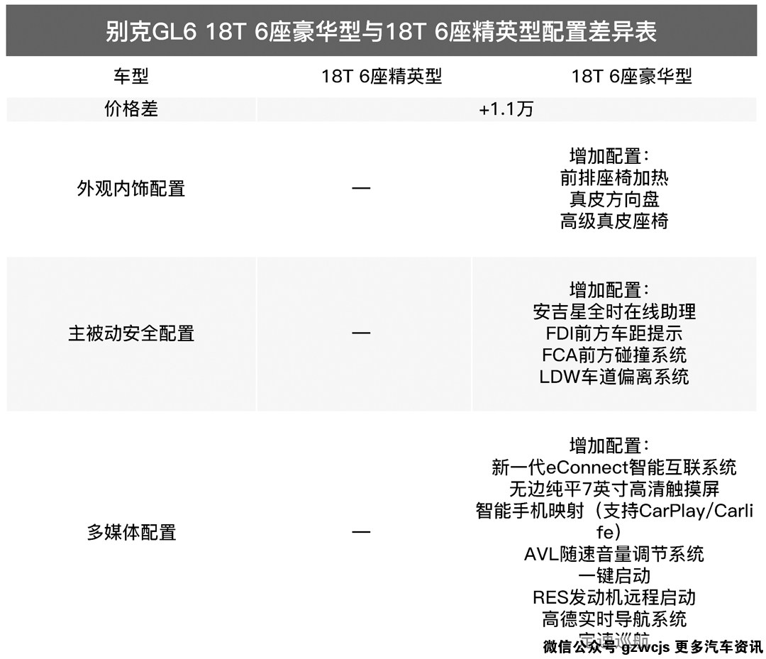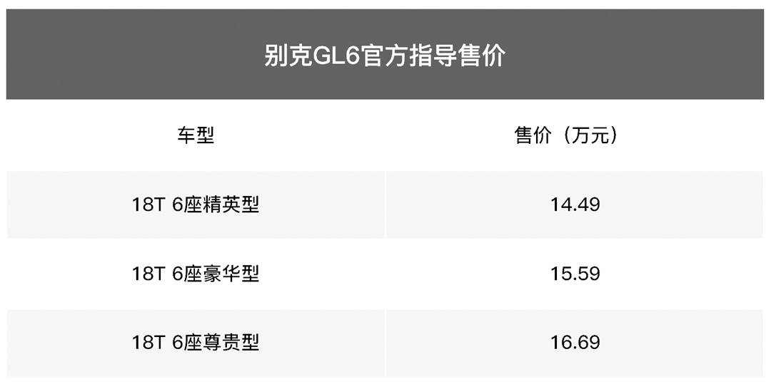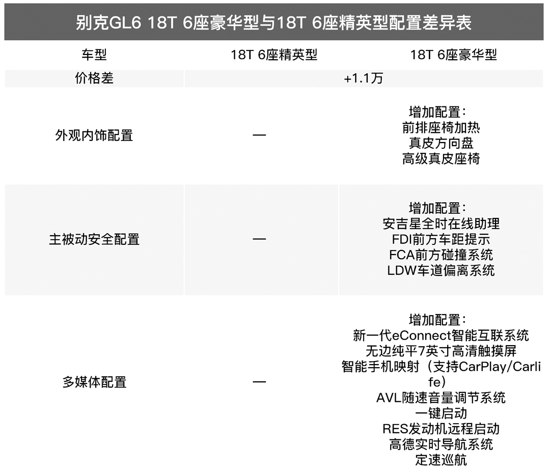 GL6一共分为三款车型,18T 6座精英型、豪华型、尊贵型每个车型之间的差距都在1.1万元之间。