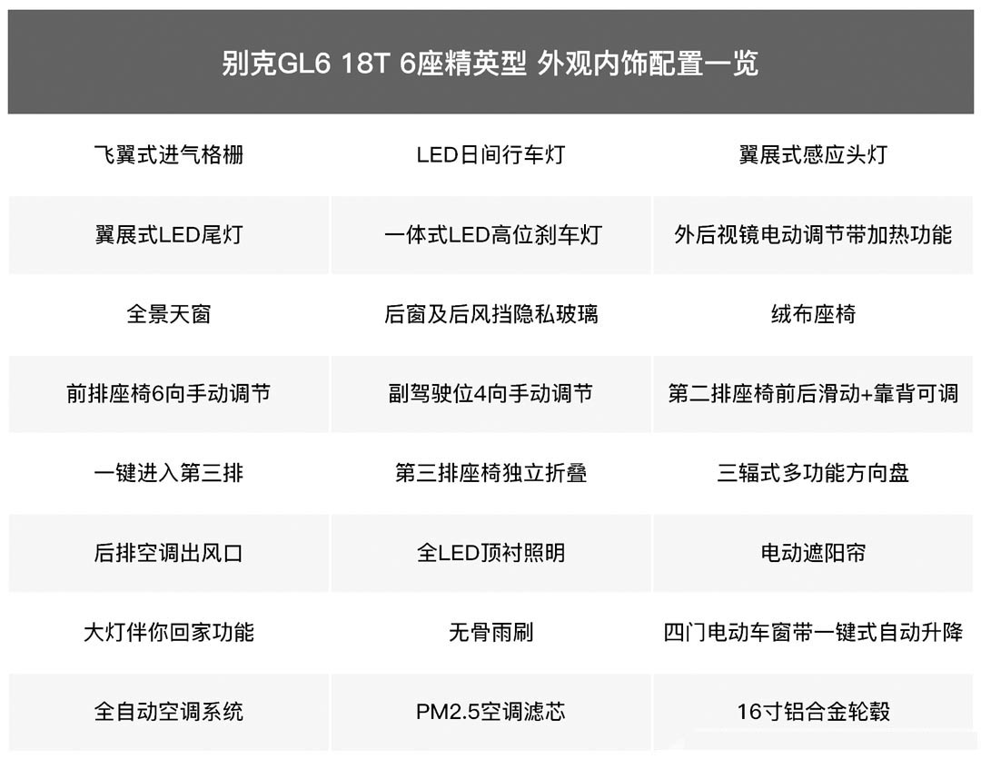 另外诸如放倒后的全平地台、后多连杆独立悬挂、6AT成熟平顺等等...再聊下去估计得把它捧上天了,算了我们还是来聊聊GL6的配置分布表现吧。