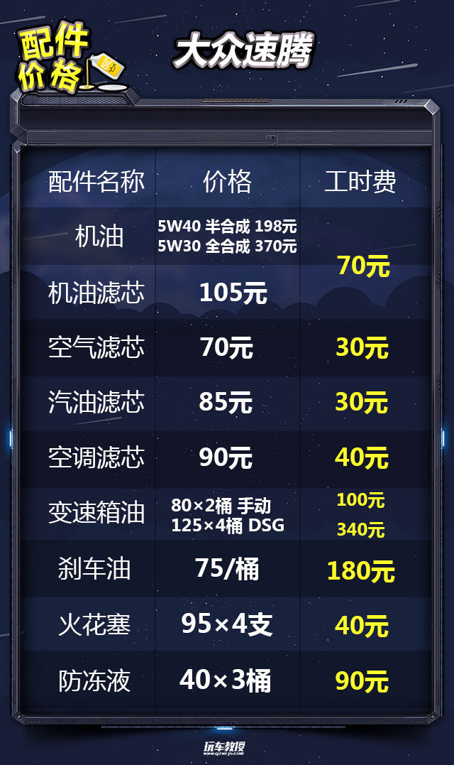 教授总结:在保养方面,速腾的1.6L与1.4TSI车型进行一次小保养分别为373元和545元。1.6L车型三年的保养总费用为3022元;1.4TSI手动挡三年的保养总费用为5230元;1.4TSI自动挡(DSG)三年的保养总费用为6160元。以关注度最高的1.6L 自动舒适型为例,每年的保养费用为1007元,用车成本为17386元,平均每月花费1616元。总体来说,速腾的保养费用在同级别车型当中比较适中。