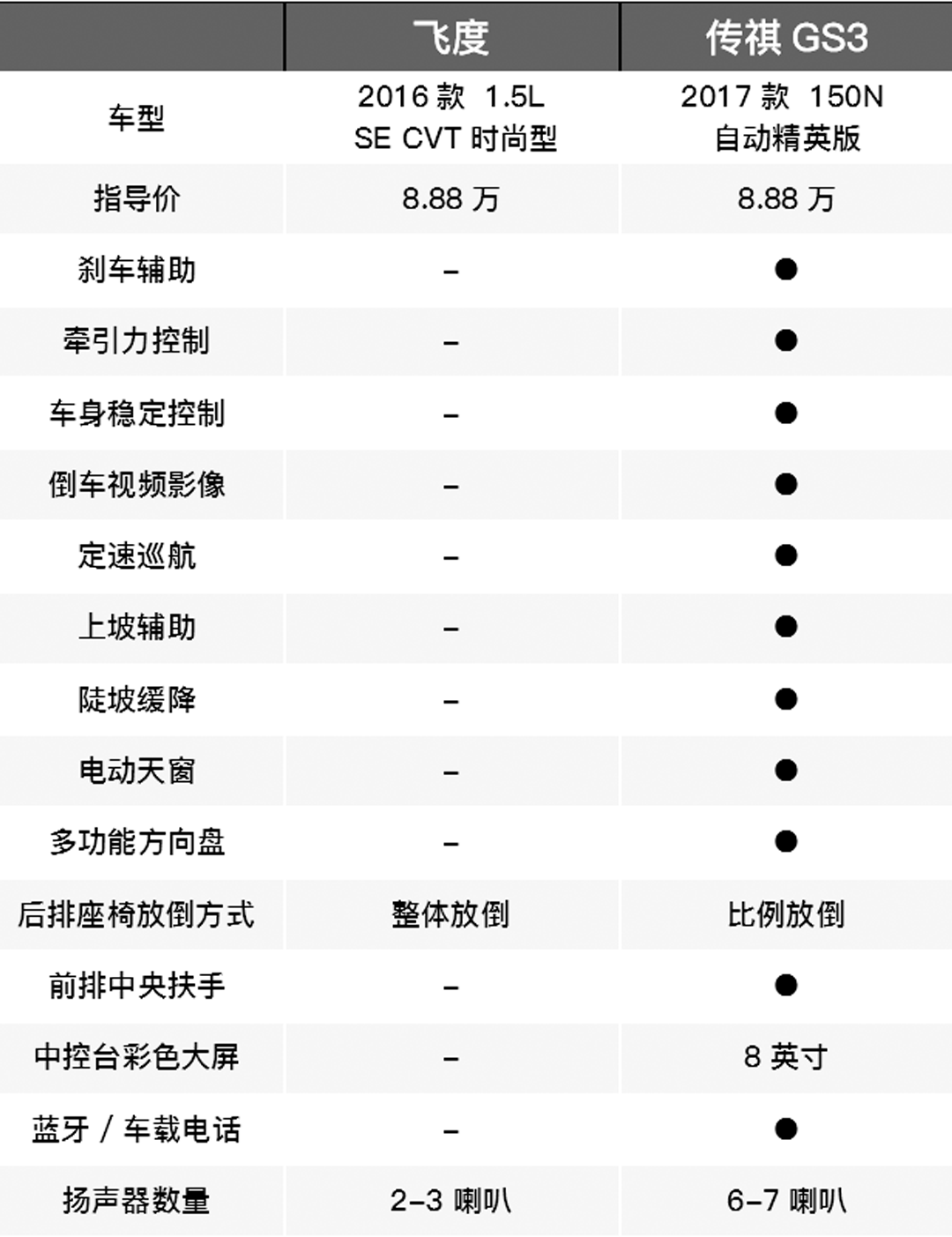 你是不是想知道它们在配置上还有其他差别?小雅以飞度2016款 1.5L SE CVT时尚型、传祺GS3 2017款 150N 自动精英版为例,列出下表: