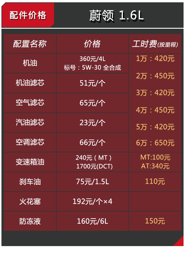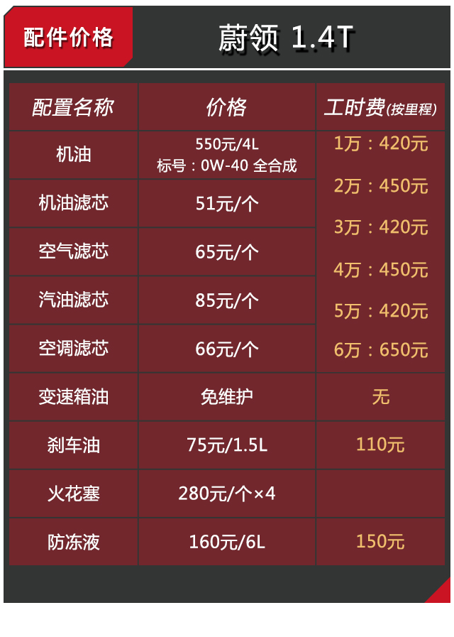 虽然说蔚领的PQ34平台旧,但旧平台也有旧平台的好处:配件极容易买,而且便宜。原厂的5W-30全合成机油4L也才360元,在合资品牌里面已经不算贵了,唯一一项价格比较贵的应该是AT车型的变速箱油了。至于1.4T车型,变速箱油更是免费呼的,省了一大笔。关于普通的保养,教授建议自己买配件找专业的修理厂会是更好的选择,起码工时费没那么贵。