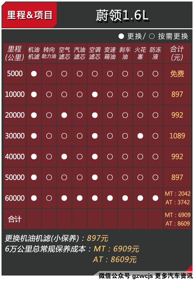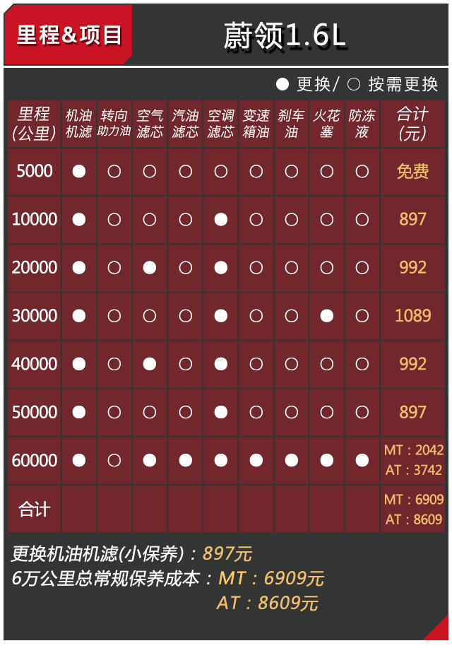 在保养项目方面,蔚领无论1.6L还是1.4T都算比较省心的,常规保养就换三滤,1.6L车型3万公里换一次火花塞,1.4T车型则2万公里换一次。到了6万公里就要进行一次大保养,包括三滤、全车油液的更换。值得一提的是,双离合变速箱油是官方免维护的,所以费用比手动挡车型略低,但建议落地5年左右的时间考虑一下换变速箱油。