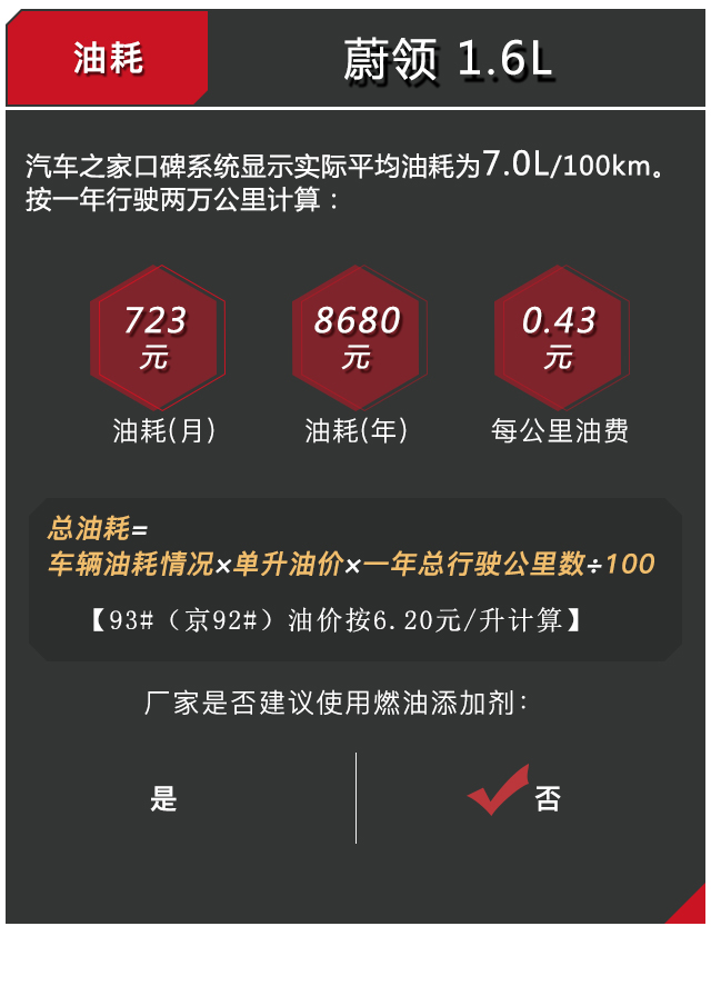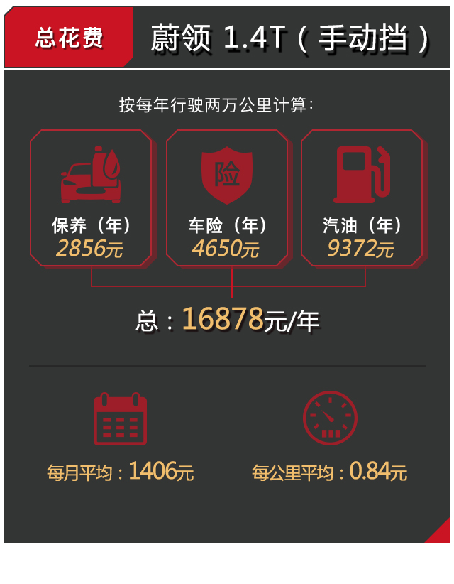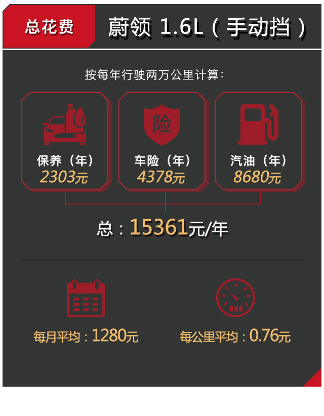 在油耗方面,1.6L和1.4T车型的平均油耗分别为7.0L和7.1L每百公里,算下来一公里都不到0.5元,已经可以算入“省油”的行列。以至于两辆车的月均花销也不高,分别是1280元和1397元,对比同平台宝来1.4T(93#油价按5.92元/升计算)的1193元和同为紧凑型车丰田雷凌1.2T(93#油价按6.53元/升计算)的1238元的月均花销,其实蔚领的用车费用十分的合理。