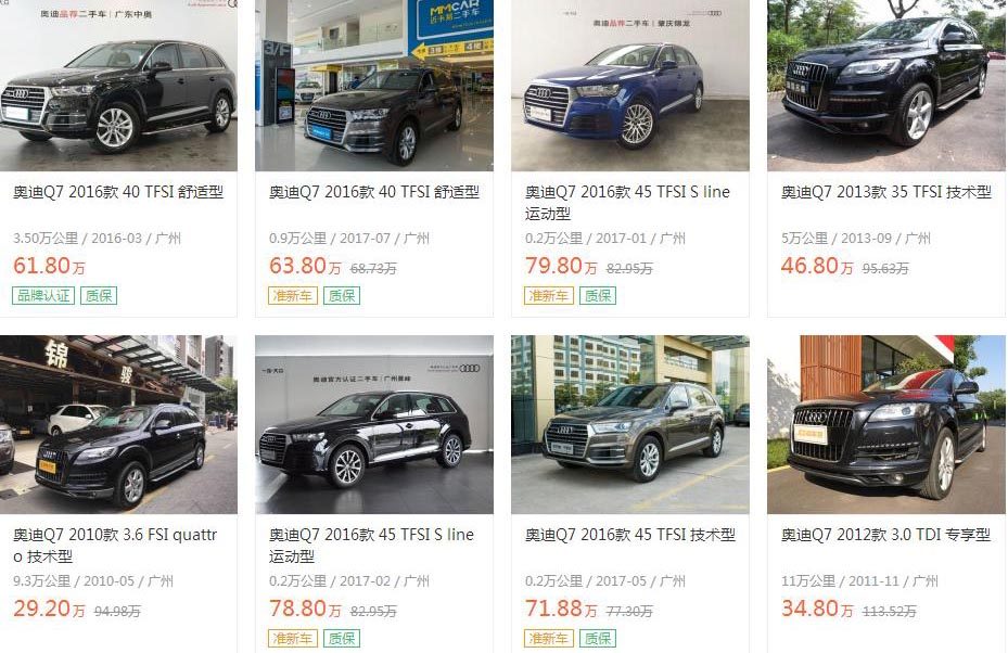 奥迪Q7也同样提供了不少选装的服务,仅仅大灯这一块就需要2-4万,所以为了面子,还是需要选一个好看的灯,起码让别人认为你开的是奥迪Q7高配版本。我们从二手市场中可以看到,市场上的车型以旧款的奥迪Q7的车源比较多,只有少量2016款的车源,而且公里数不超过一万公里。
