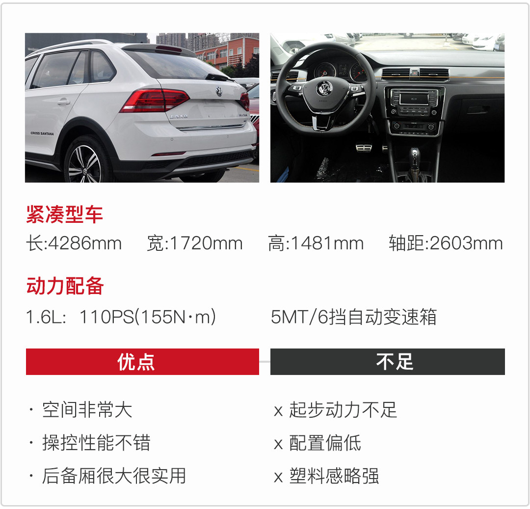 三厢车型的行李箱容积为466L,可是后排不能放倒,浩纳和Cross则没问题,最大容积为1255L,进气格栅采用黑色网状,轮眉、侧裙和前后杠跟Cross Polo一样采用黑色包围,车身侧面有这CROSS SANTANA标识,是CROSS就是CROSS,不像一些车型升高底盘就说自己是城市SUV。