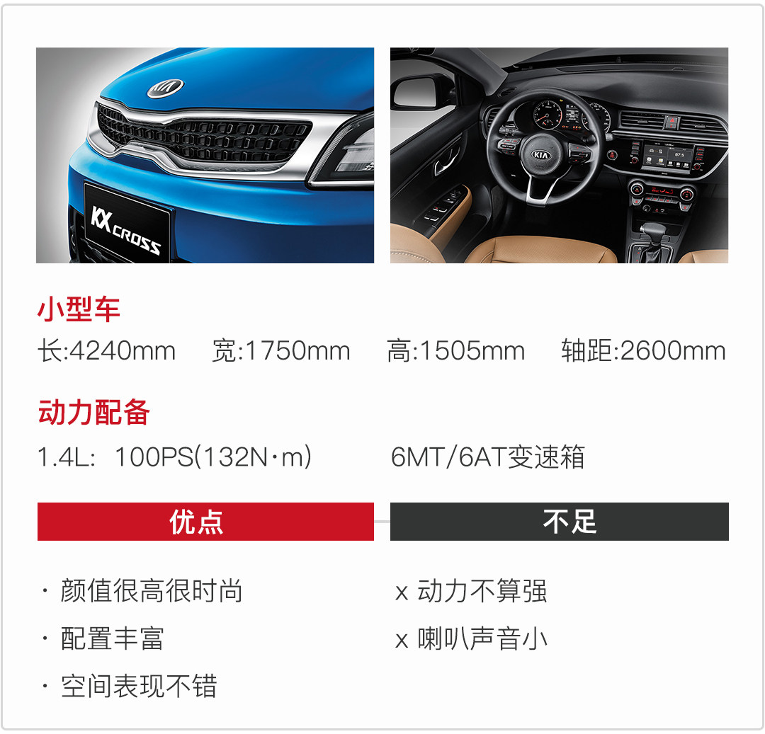 KX CROSS其实是全新K2两厢版改装而来,不得不说起亚高颜值高性价比的优势又赢了,外观不多说,一看就很舒心;只有两个车型,MT和AT,指导价分别是7.49万元和8.59万元,顶配就跟CROSS POLO低配一个价位,配置还非常丰富,无钥匙启动、倒车影像、ESP,
