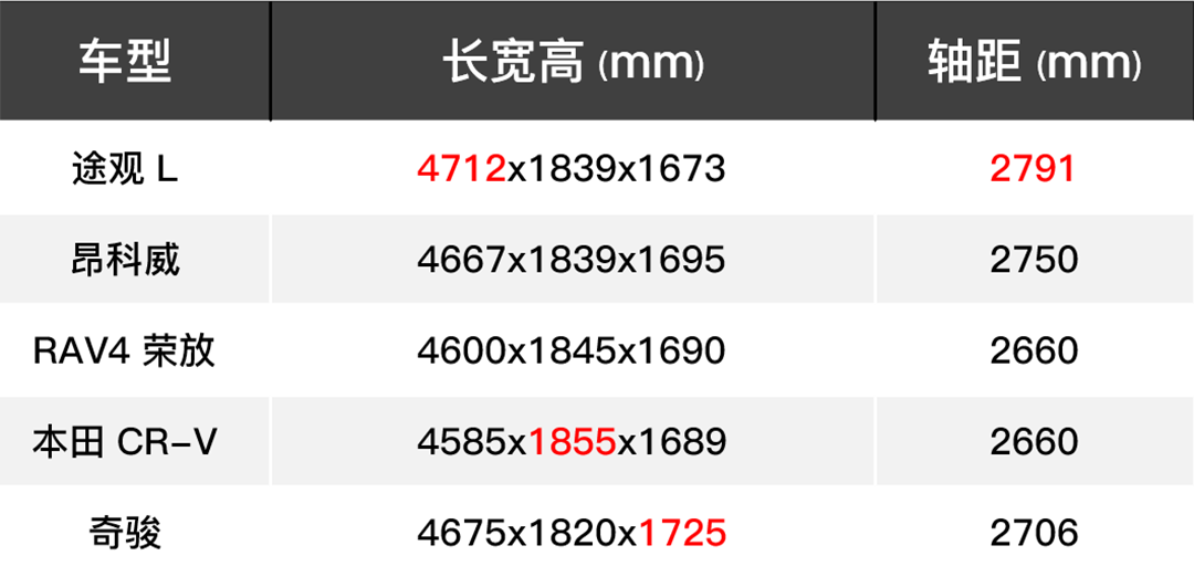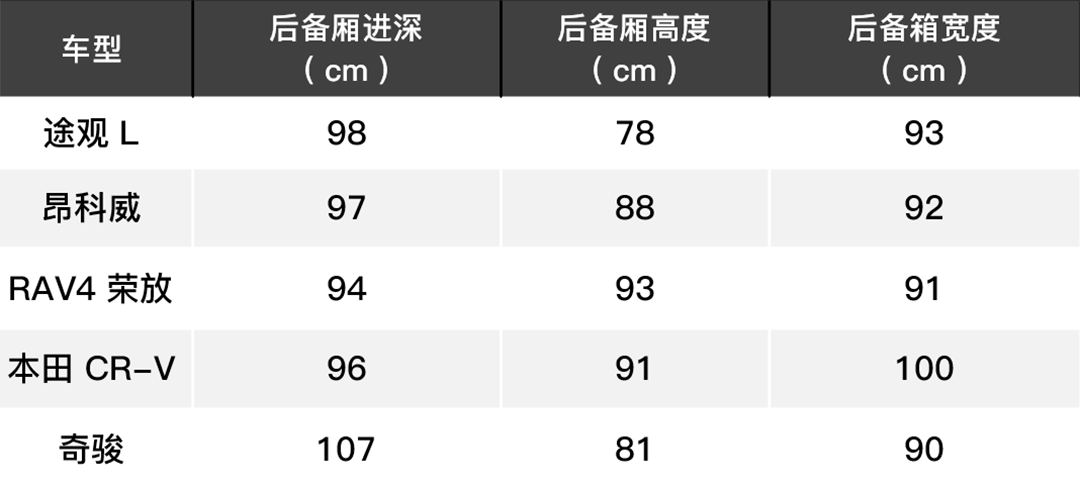 从表中我们可以看出,途观L的长度以及轴距最长、本田CR-V的宽度最大,而奇骏是最高的,不过整体来说作为中型SUV的途观L与昂科威比其他三款紧凑型SUV要大一些。