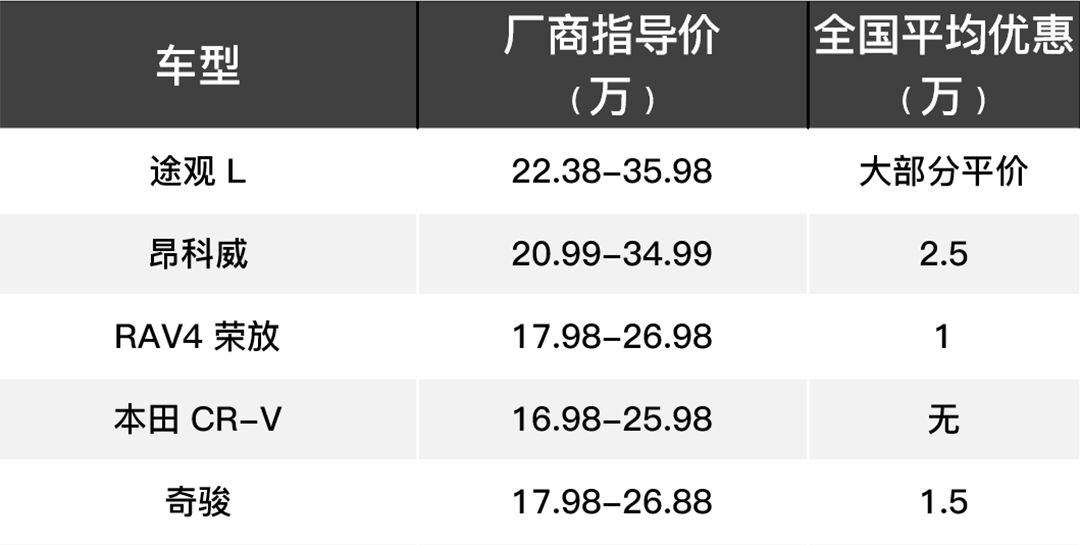 从厂商指导价来看,途观L与昂科威的定位要高一些,这与它们精致的做工以及强大的品牌号召力是分不开的,同时昂科威是五车中平均优惠幅度最大的。本田CR-V基本上没有什么优惠,但是其售价本身就是五车中最低的,所以性价比也算不错。