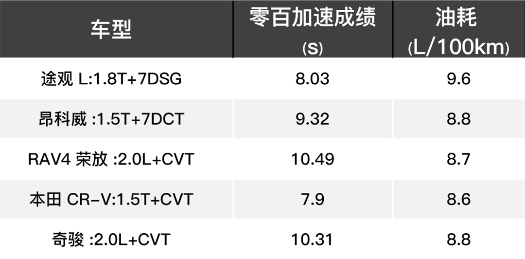 1.8T的途观L加速较快,但是油耗有些偏高。相比而言,在动力与油耗获得双赢的还是本田CR-V,小雅不得不叹服它的黑科技。