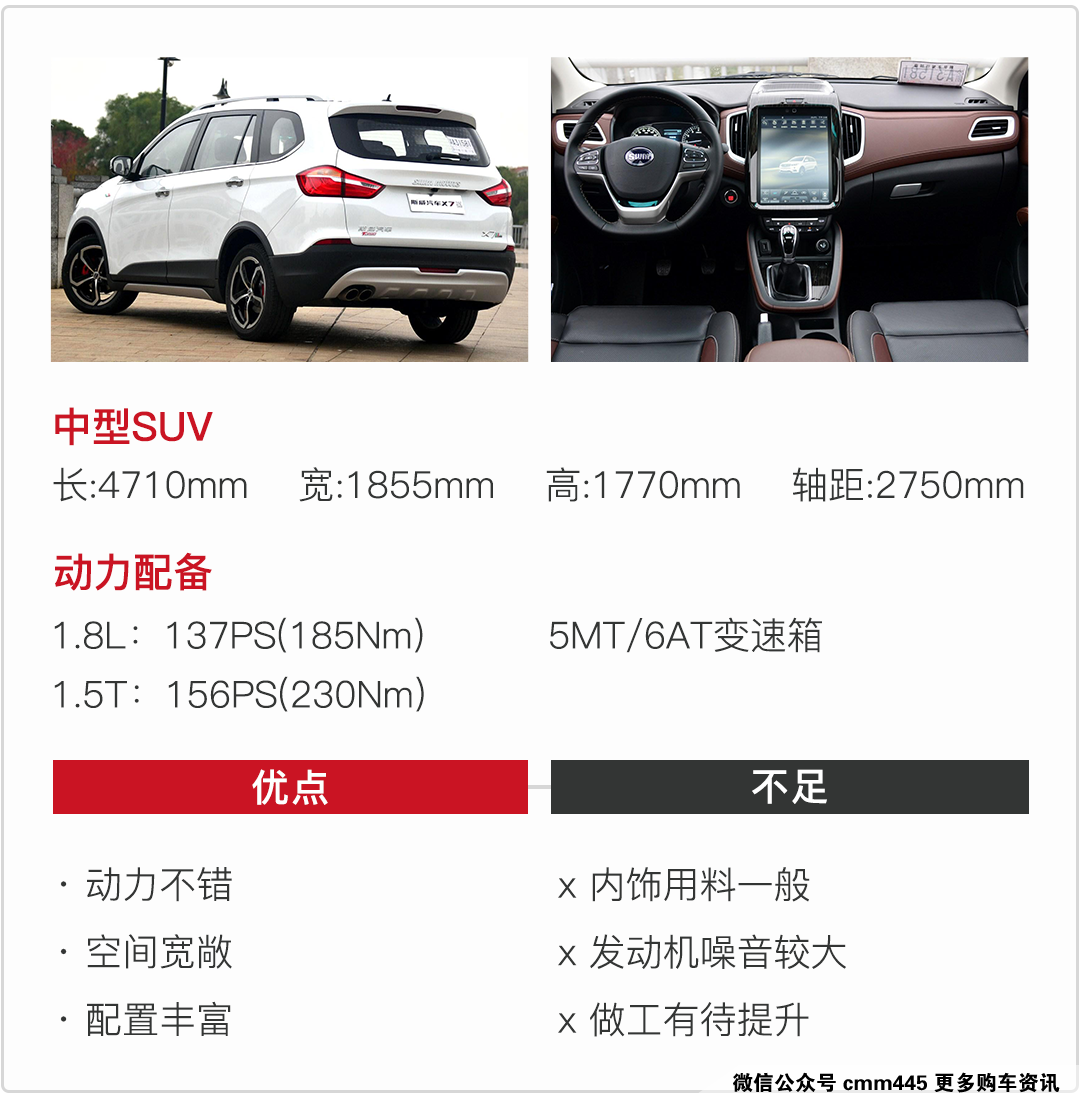斯威X7的造型设计比较大气、时尚,车内12英寸显示屏也能让人眼前一亮。只是它所搭载的1.5T+6AT的动力总成低扭表现不强,在动力表现上差了点意思。