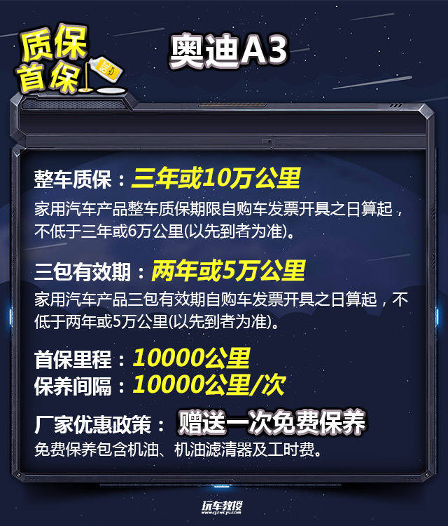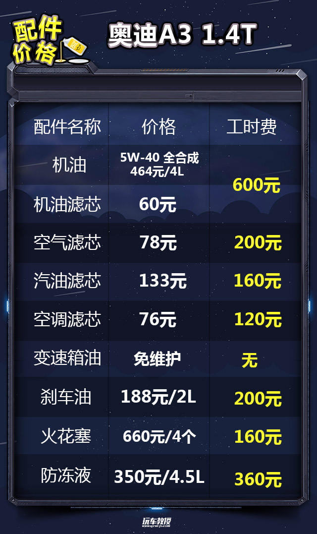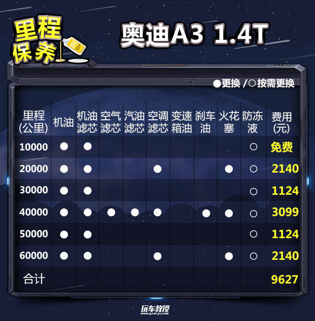 教授总结:奥迪A3的首保里程是10000公里,保养周期为10000公里/次。小保养需要1224元,价格比较的贵,主要的原因在于工时费偏贵,动辄就是几百,不过这也是豪华品牌的收费水准。一万公里一次的保养周期有着一定的优势的,所以六万公里总的保养费用还算合理。1.4T车型每月平均1810元的养车费用,介于雅阁2.0L(1754元)和2.4L(1921元)之间,对于大多数人还是能够接受的。