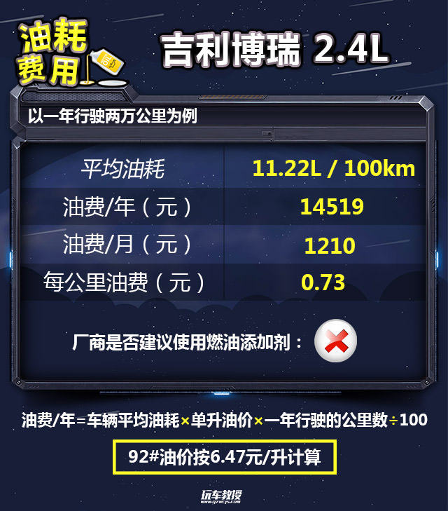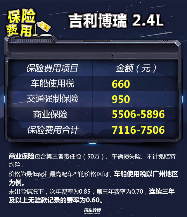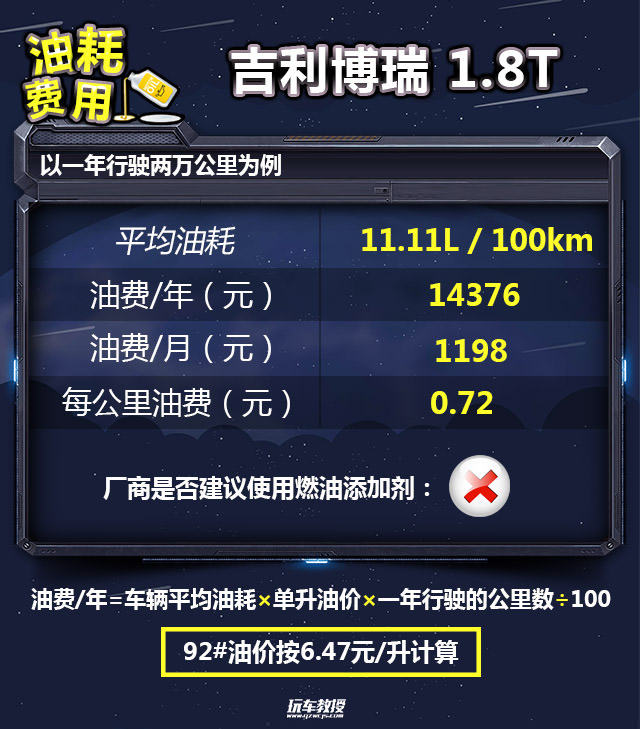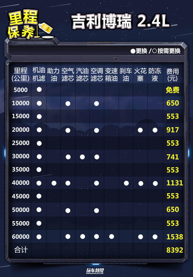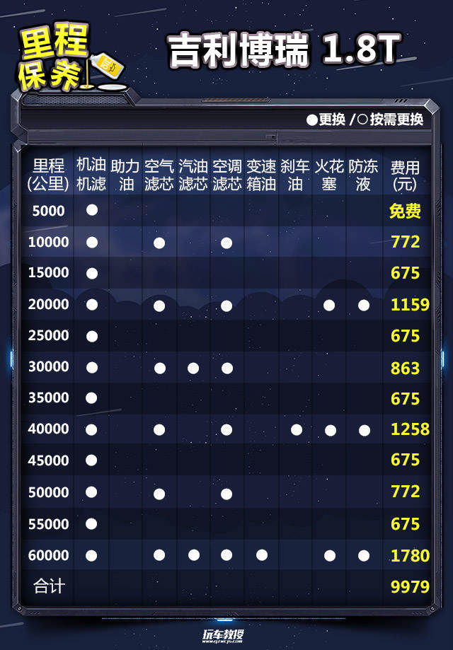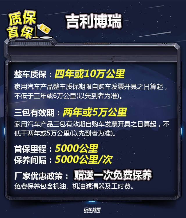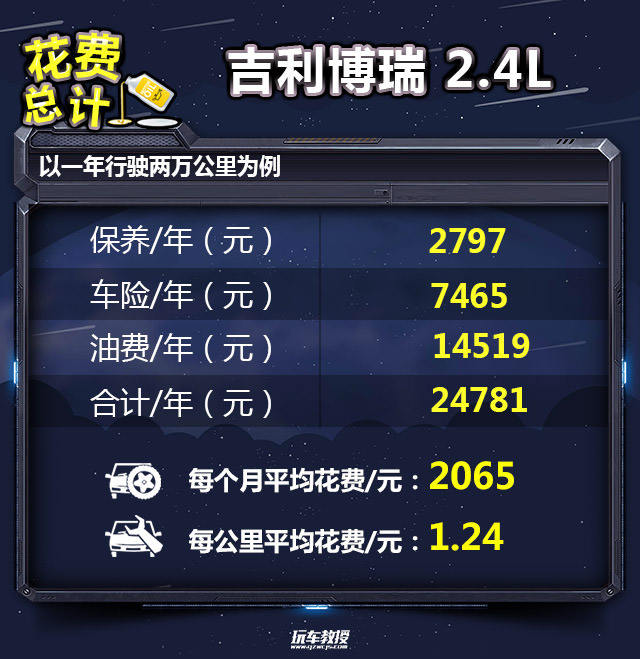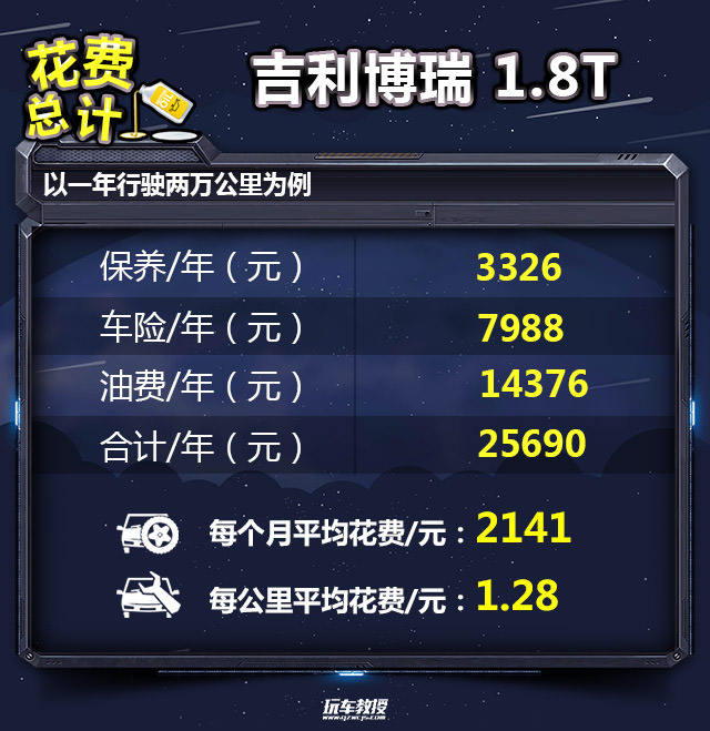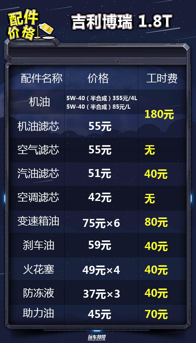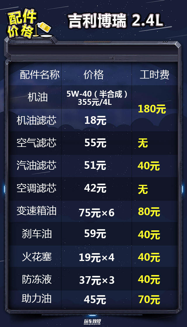 教授总结:博瑞提供了四年或10万公里的整车质保期,保障力度做得更到位。在使用半合成机油的前提下,博瑞1.8T和2.4L车型行驶6万公里的常规保养费用分别是9979元和8392元,这样的费用甚至要超过同级别的合资车型。1.8T车型需要5L机油,这也是其保养费用要比2.4L车型高的主要原因。博瑞的1.8T车型平均油耗偏高,所以油费方面并不低。总而言之,博瑞的养车费用比同级别很多对手都要高,但是你能享受更多的配置,主要看你如何去权衡了。