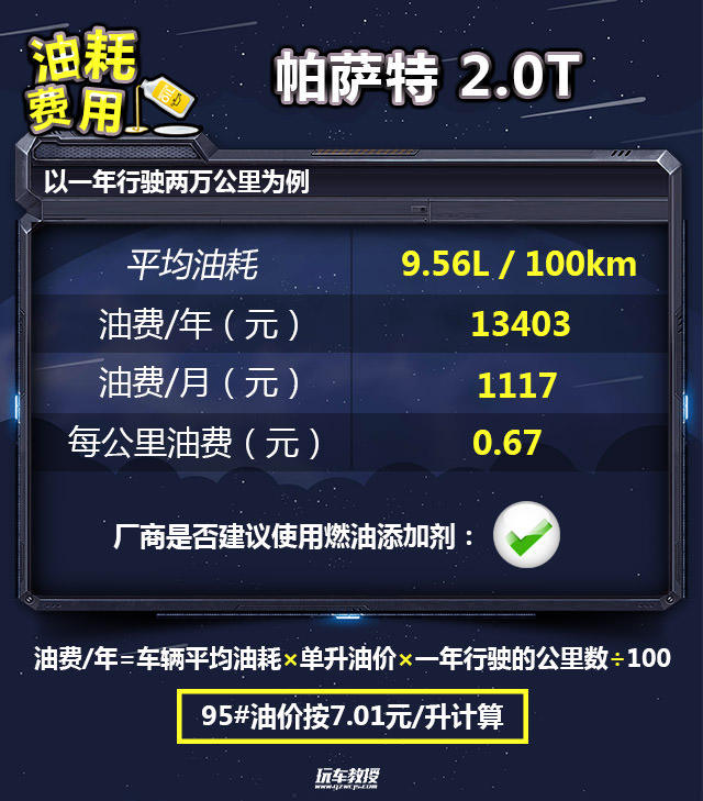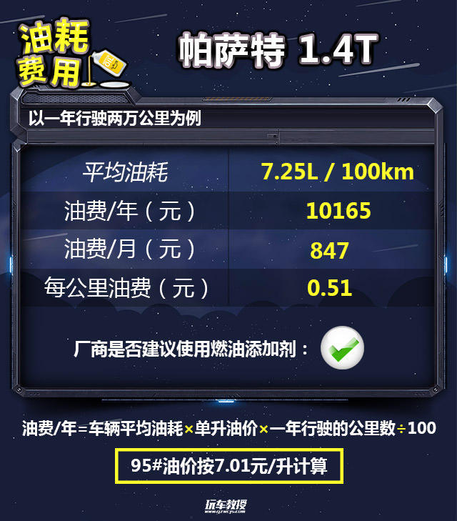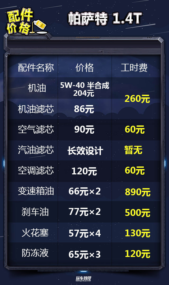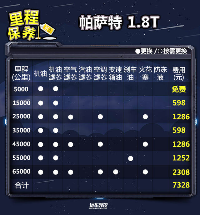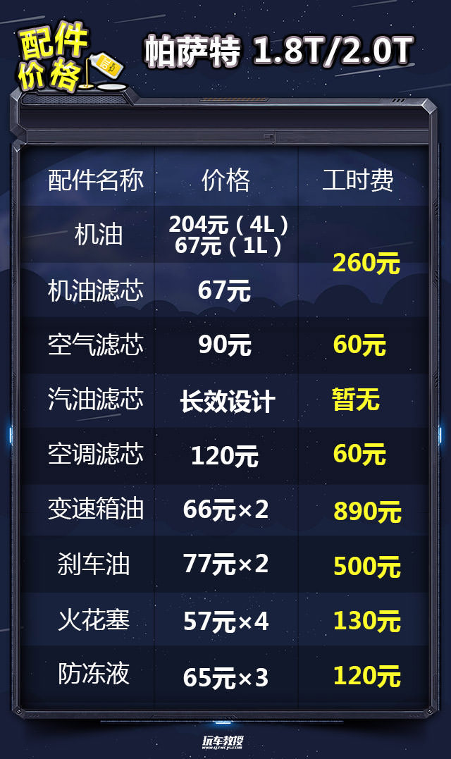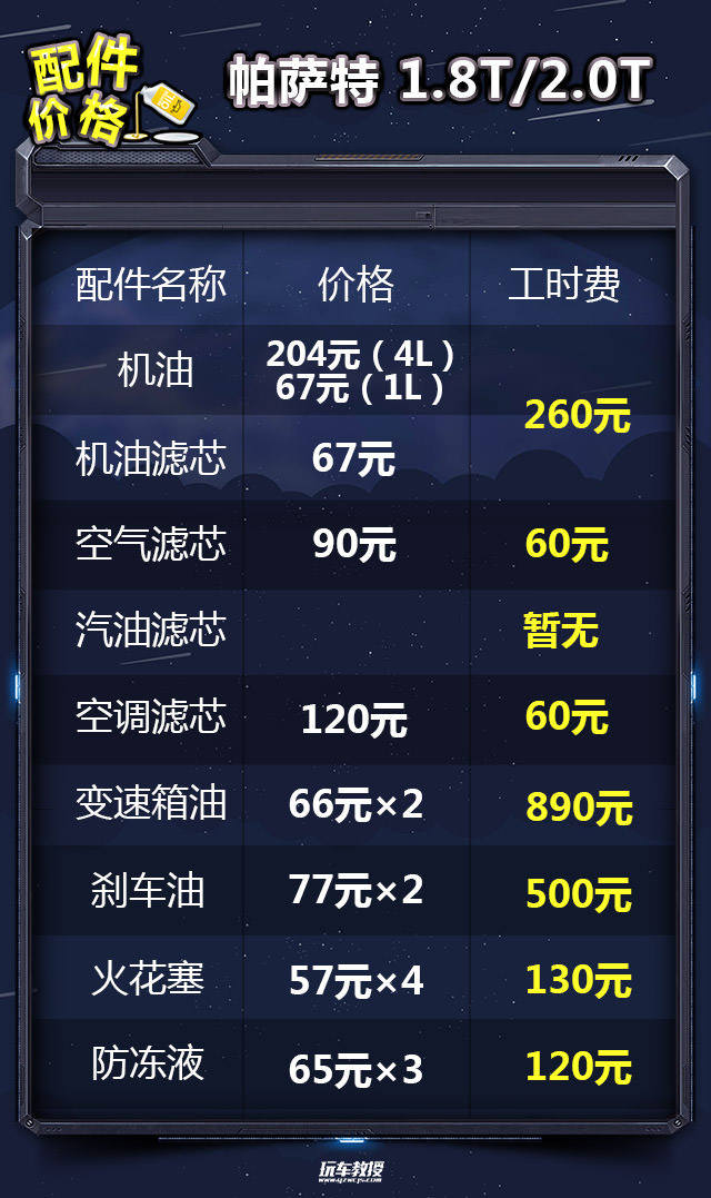 教授总结:帕萨特的保养费用相比迈腾要低了很多,小保养最低需要550元,迈腾为985元,这其中也有帕萨特使用的是半合成机油的原因。1.4T、1.8T和2.0T车型6.5万公里常规保养费用接近,费用比较合理。一年合计花费方面,1.4T车型为20637元,1.8T车型为24145元,2.0T车型为24882元,整体比迈腾低1000-2000元,主要是在保养方面的花费比迈腾低。