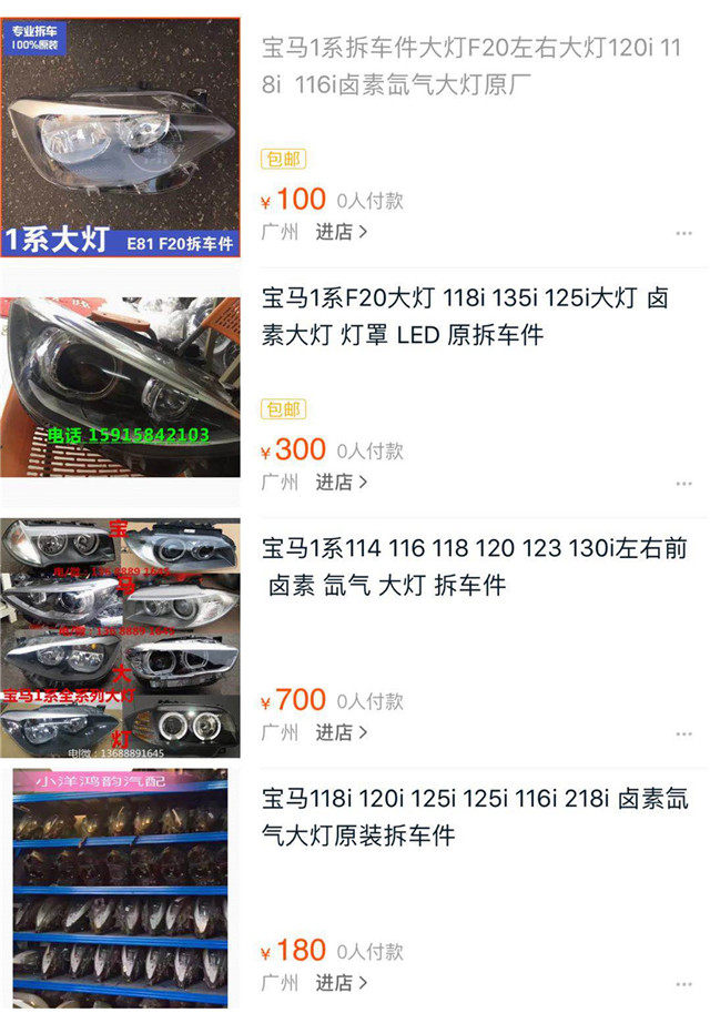 这就是我们通常所说的拆车件。当然还有一种是比方说有个宝马118i时尚型被人追尾了,三厢车硬是被撞成了两厢,幸好车主没事,但车只能报废了,那车头的零件总不能不要吧,于是就把车灯拆下来卖了,这种也是拆车件,价格更便宜,只不过可能质量没那么好。
