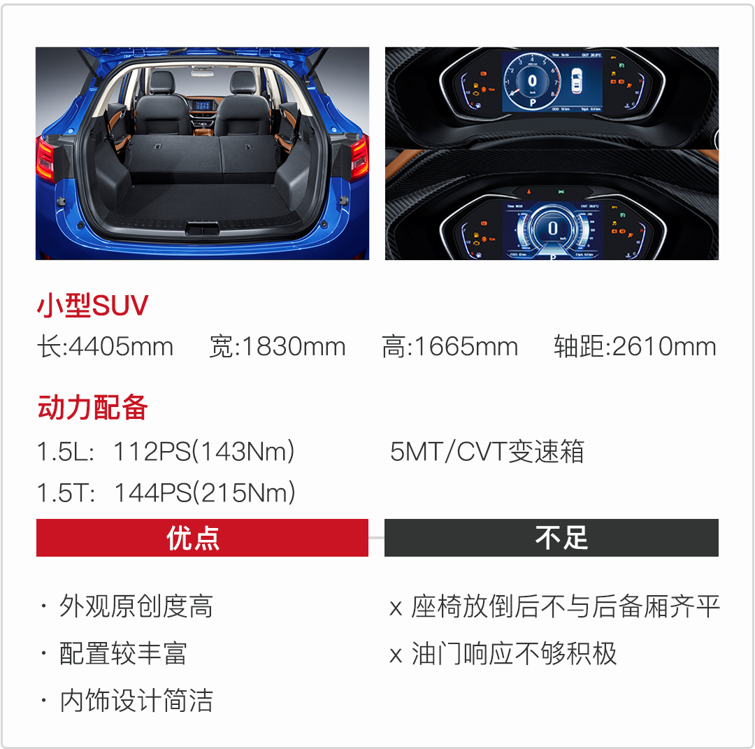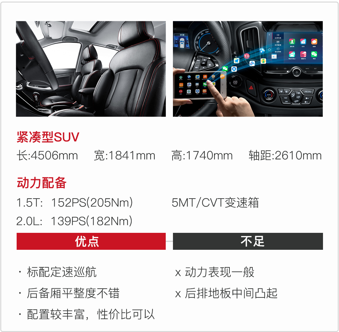 比起瑞虎5,凯翼X5有着更低的售价、更丰富的配置,标配全景天窗、定速巡航、真皮方向盘、LED日间行车灯等国人很喜爱的配置。动力方面也有1.5T与2.0L两种选择,能满足日常需求,是一款性价比还不错的SUV。