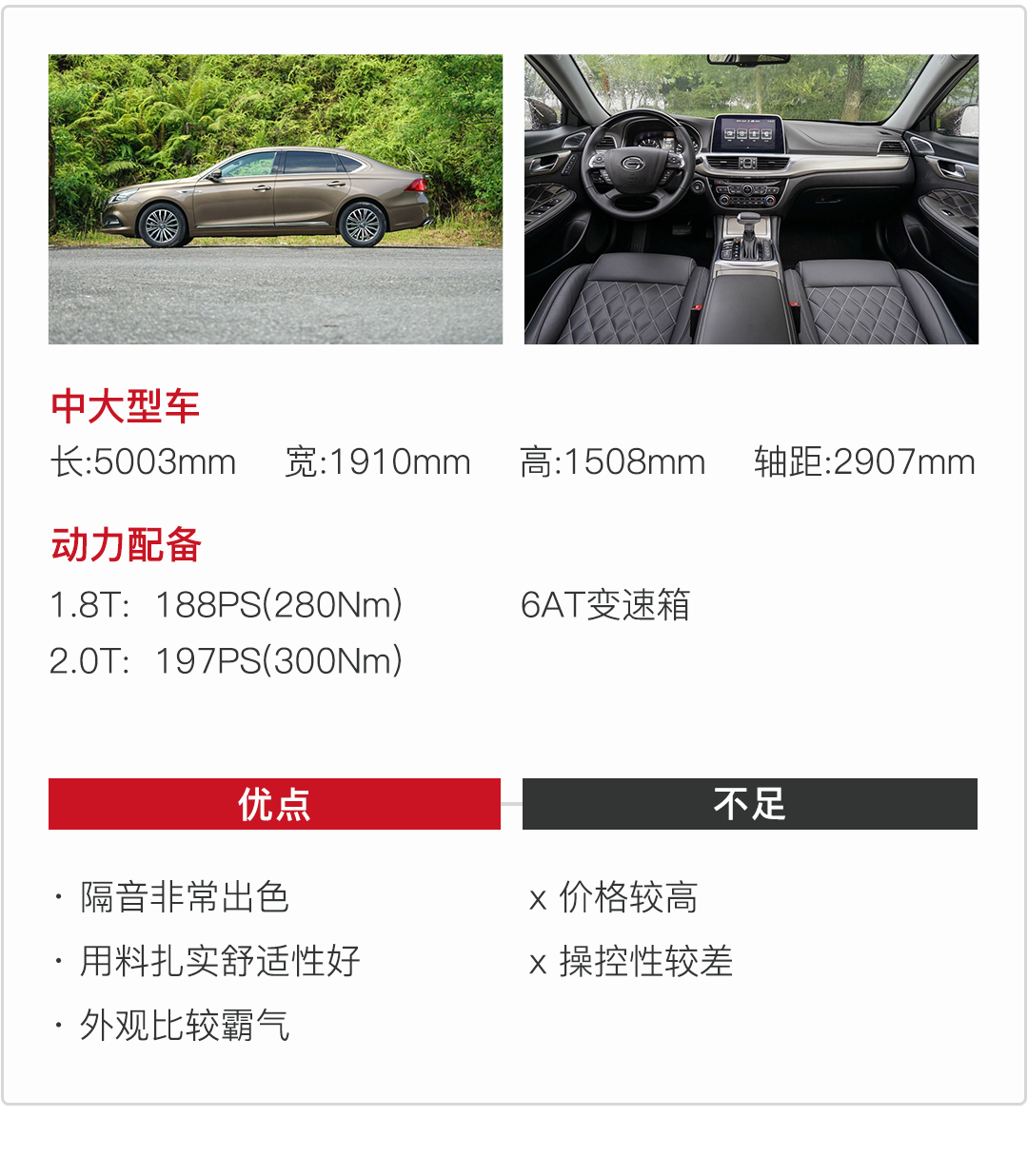 当然,在其它的方面传祺GA8也不弱,虽然说相比较同级别的中国品牌对手来说它的起步价有一些贵。但是14.98万的起价就能够提供超过五米长的长度,超过一米九的宽度这么硕大的尺寸。再加上1.8T的发动机能够提供188马力280牛米的输出这样的输出水平也不逊色于合资车,在配置上电子手刹、车身稳定系统、定速巡航、电动天窗、一键启动、主副驾驶电动座椅、10.1英寸中控大屏以及氙气大灯在最入门的车型上就已经成为标配,所以传祺GA8性价比其实非常高。