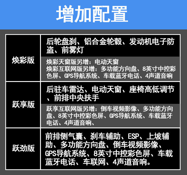这个配置在娱乐性方面比较全面,而且,如果你对安全性有要求,可以后期加装侧气囊、刹车辅助、ESP等配置,价格和直接购买跃劲版是一样的。