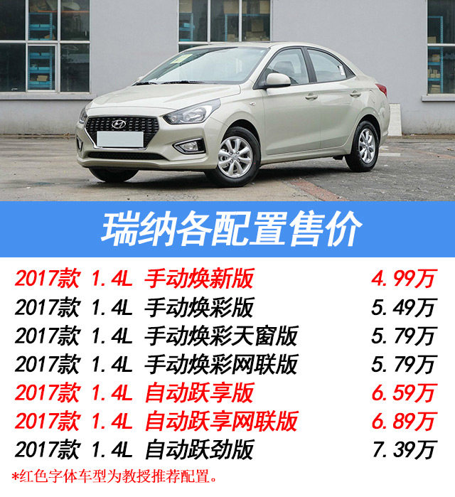 出于某种众所周知的原因,韩系车今年在中国销量跳水。为了挽回销量,现代直接祭出大招,将新款的瑞纳官方价直接降价30%以上。所以这款原价7.39万-10.69万(16款)的现代瑞纳现在仅需4.99万-7.39万(17款)。更加难能可贵的是,17款4.99万的车型配置比16款7.39万的车型配置更加高!教授已经找不出性价比更高的合资小型车了。