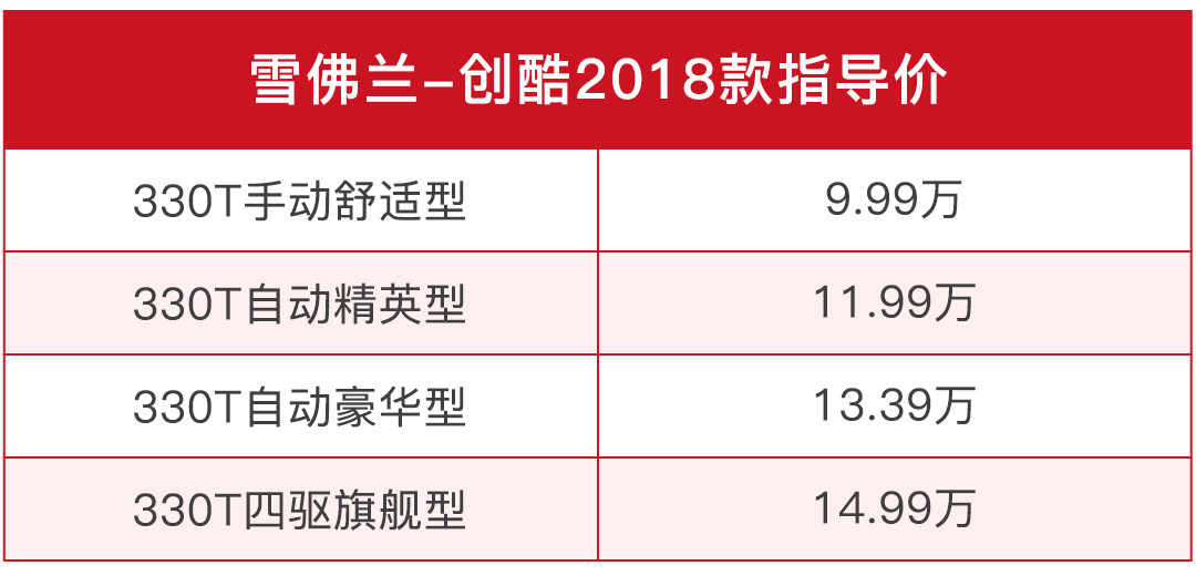 目前小型SUV市场持续火爆中,小小的车身下有着不错的空间、看起来也有一定的气势,加上通过性好、价格不算很高等优势,小型SUV很受年轻人或年轻家庭欢迎;几乎每个合资品牌都有一款属于自己的小型SUV,其中,雪佛兰的创酷就是比较早推出的一款,它于2014年正式上市,2016年又出了全新创款改款车型,10月30日,2018款创酷上市,新车包含1款手动挡和3款自动挡车型,价格区间为9.99-14.99万元,对配置进行了升级,加量不加价。这款不少人都认为性价比颇高的车改款后优势会更加明显吗?请让我给你好好分析一波。