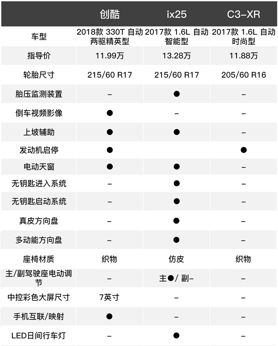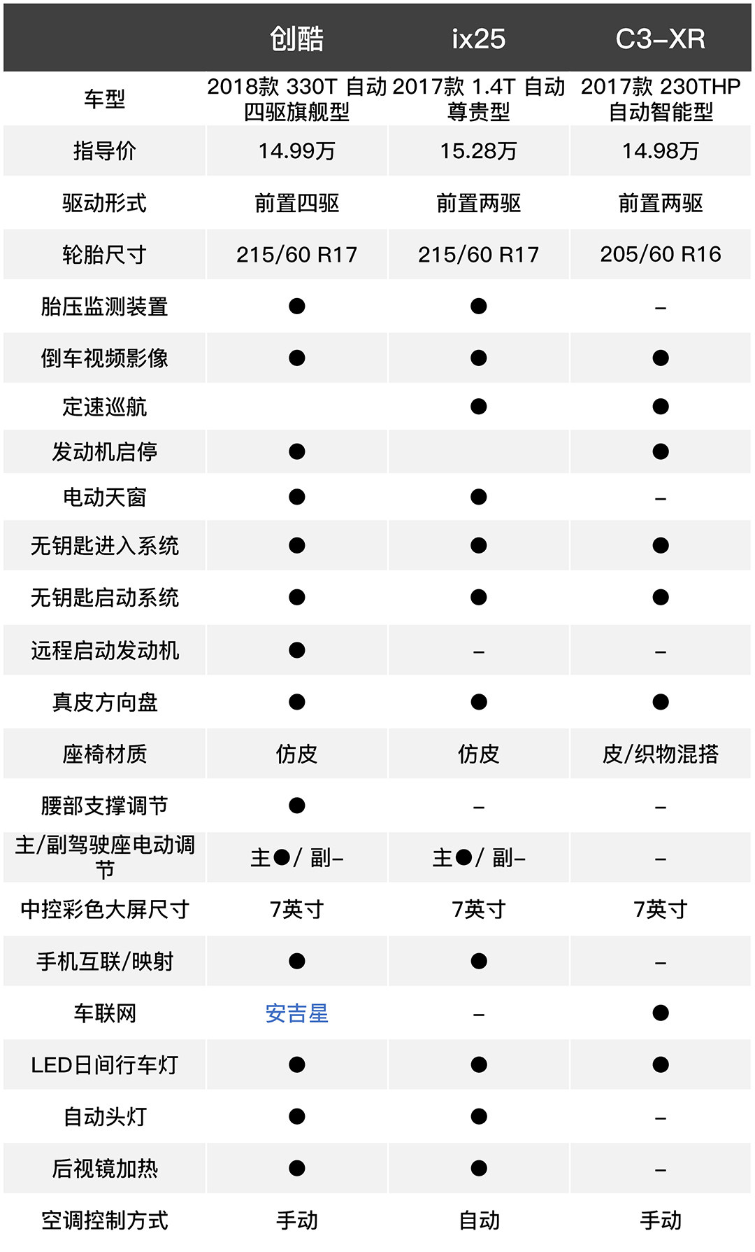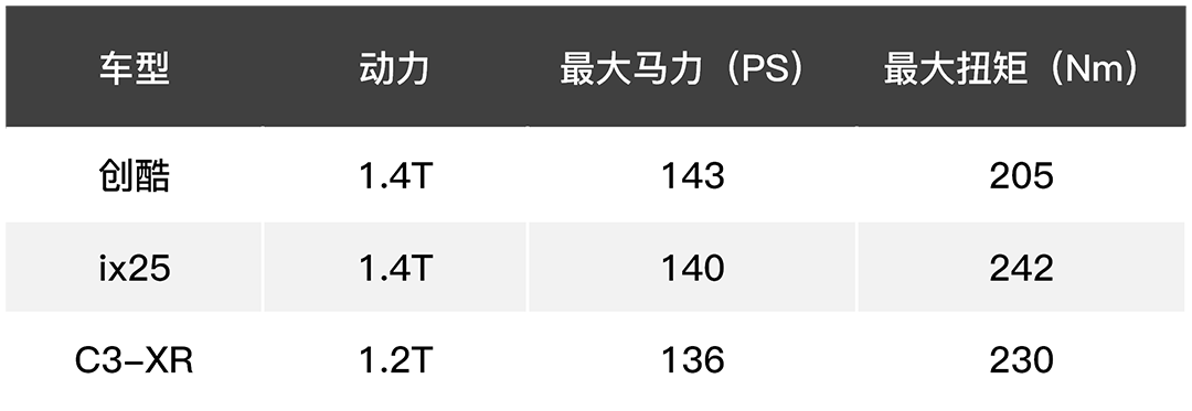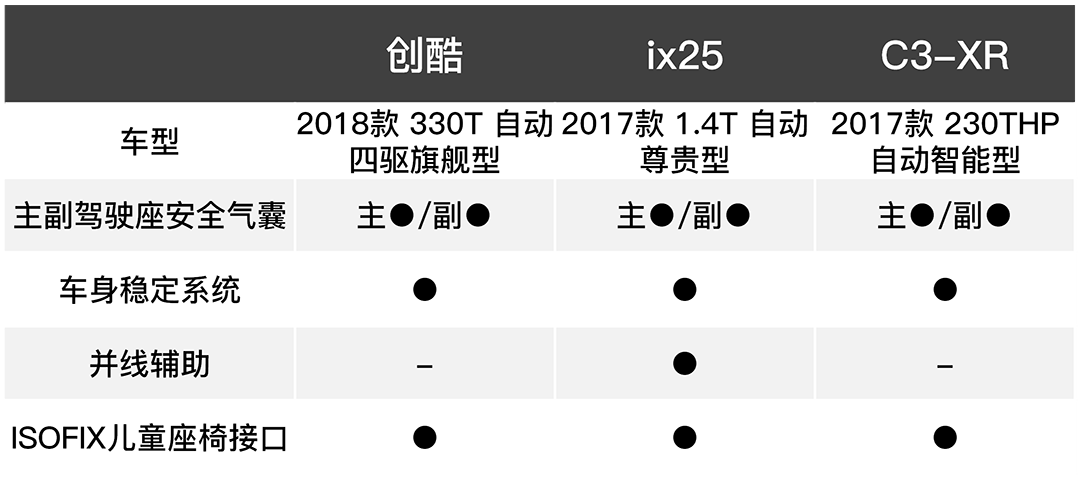 可以看到, 创酷14.99万就能买到1.4T四驱旗舰型,而ix25(15.28万 尊贵型)和C3-XR(14.98万 智能型)你只能买到1.4T和1.2T的两驱版本。另外,创酷在主动安全配置、舒适配置、多媒体配置等上面都有一定的优势。