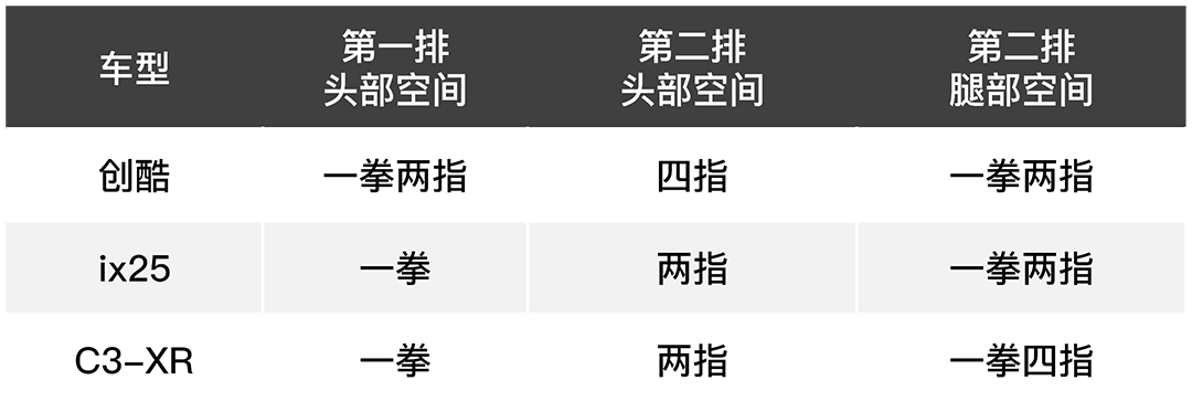 从对比中可以看到,创酷的头部空间比两款竞品都有优势,如ix25和C3-XR,虽然腿部空间也不错,但头部略显局促的话空间体验会打折扣。整体而言,这三款车算是各有优势了,都符合目前同级别的正常水平。