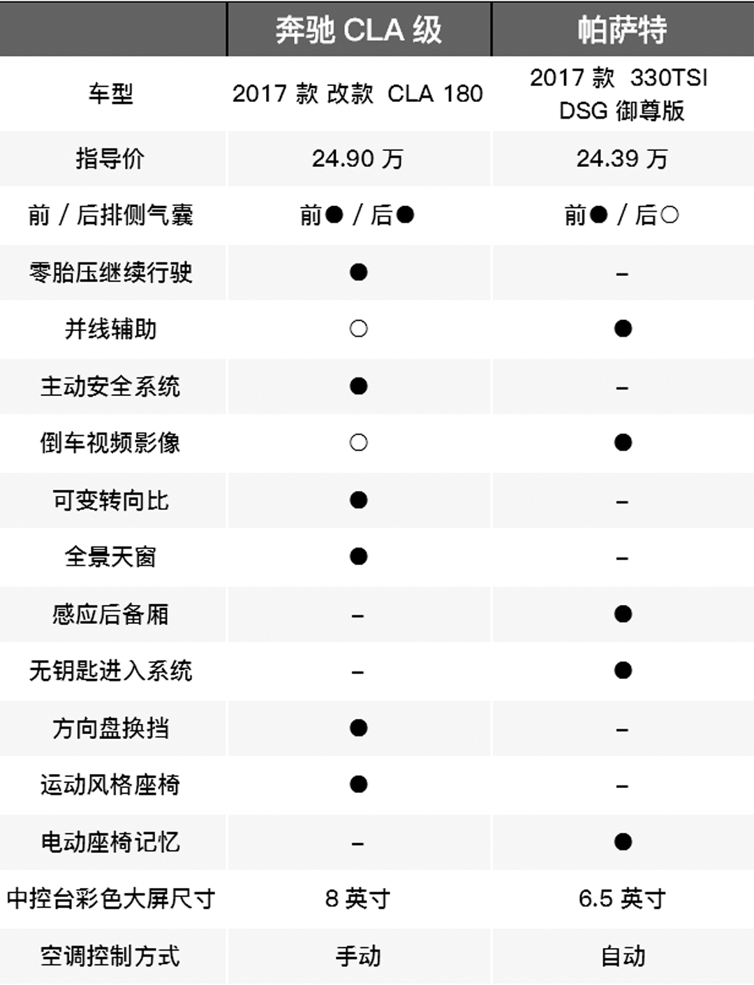 小雅拿奔驰CLA级2017款 改款 CLA 180车型来说吧,前后排侧气囊、前后排头部气囊、膝部气囊通通不会缺席,更有主动安全系统与疲劳驾驶提示,在安全配置方面做得很到位, 与帕萨特2017款 330TSI DSG御尊版相对比它的配置也并不差到哪里去: