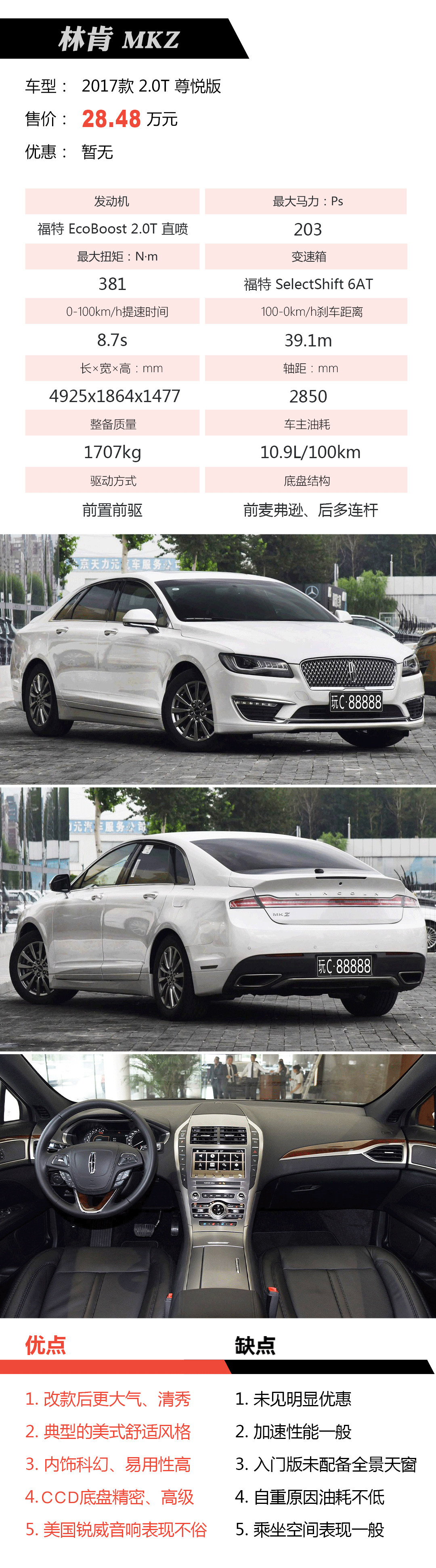 MKZ的外观造型依旧夺目,虽然新款前脸的个性度远不如老款飞翼式格栅,但更大气、更符合主流审美却是不争事实。内饰的调整着重实用度和便利性,由内至外散发着总统贵族气息。驾驶感受方面,MKZ提供地道的美式舒适,厚重扎实、静谧。