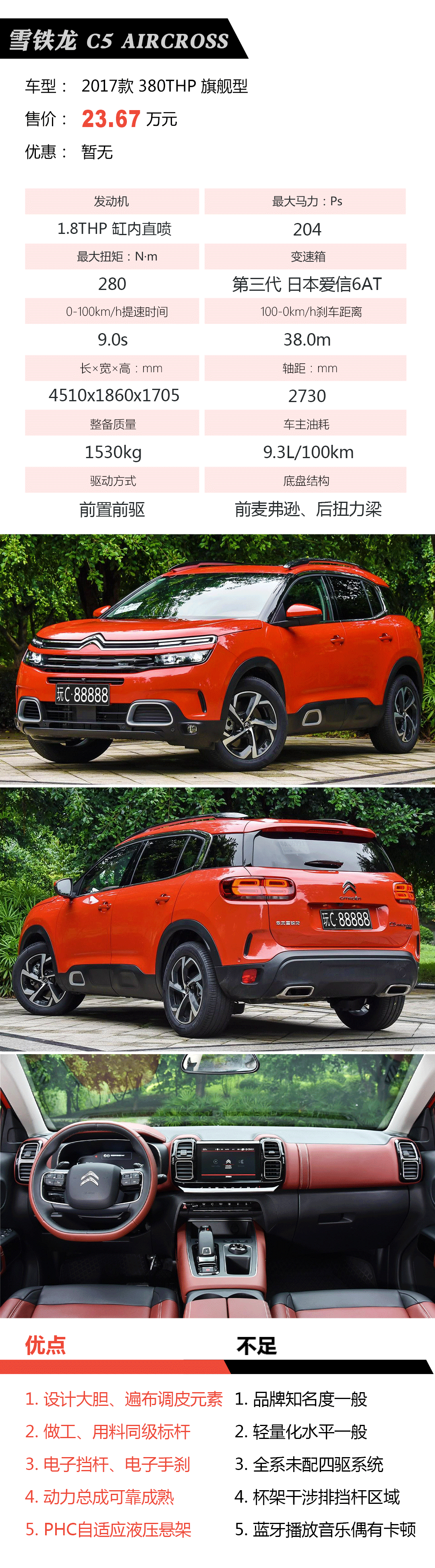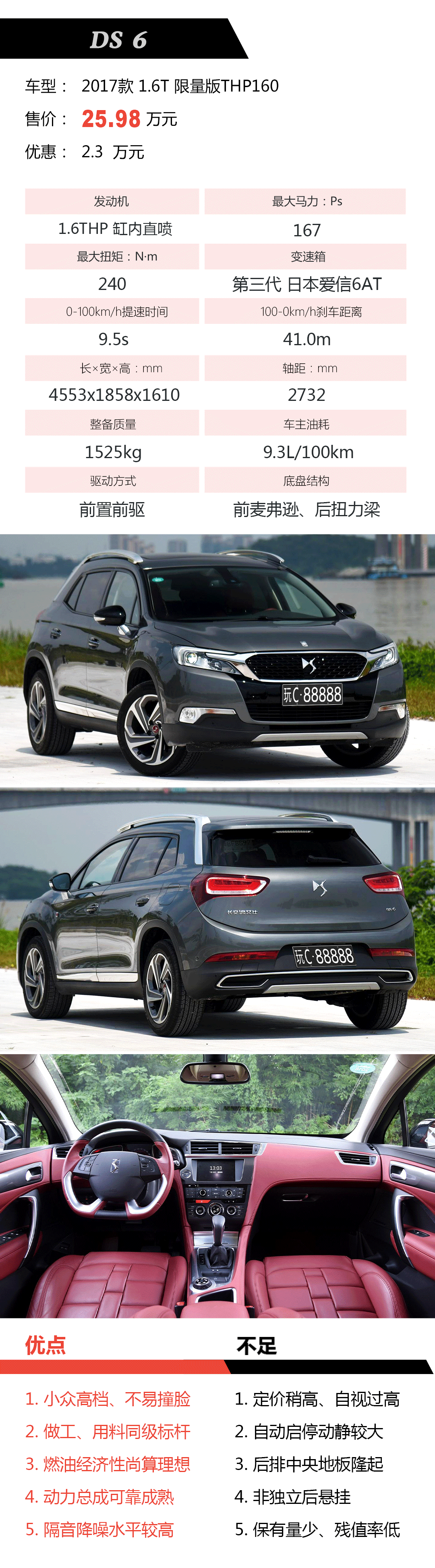 品牌冷门、实用性和性价比一般,但不足以掩盖其同级标杆的内饰用料和精致度,执着选用全Nappa真皮座椅、无沥青环保阻尼片、车内空气净化器。但扭力梁后悬挂和四驱系统的缺失让其竞争力进一步减弱,注定小众的DS 6,是时候放下身段加大优惠力度了。