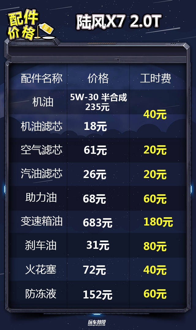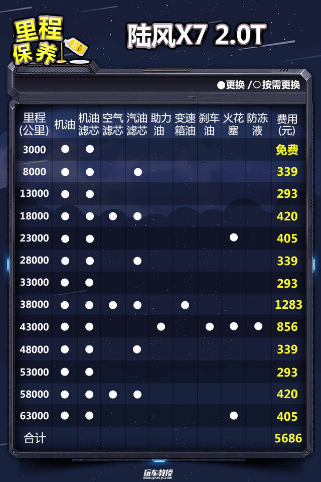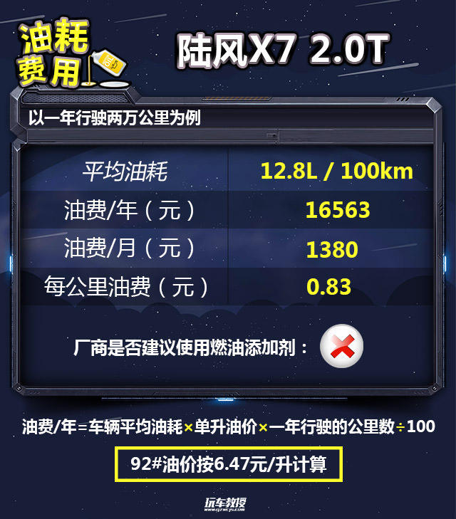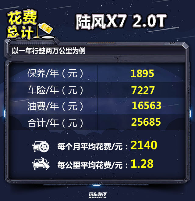 教授总结:陆风X7的小保养费用是293元,6.3万公里的保养总费用是5686元,折算下来每年大概是1895元,相比宝骏560要高,比东南DX7要低,处于中等水平。陆风X7搭载了2.0T的三菱发动机,匹配8AT的变速箱,平均油耗高达到12.8L/100km。按照一年2万公里计算,每年油费是16563元,这个费用非常的高。2.0T车型一年花销为25685元,每月花销2140元,整体的花销在合理的范围。