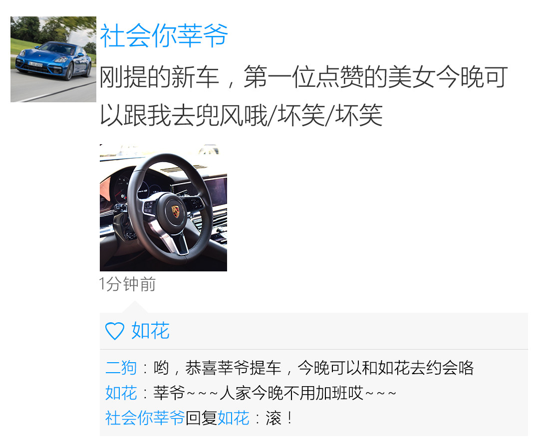 二狗:莘爷,听说你和如花在Panamera里面做不可描述的事情