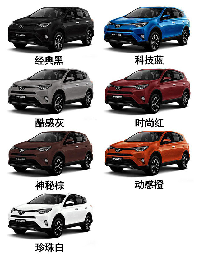 在颜色方面,RAV4荣放提供了7款颜色,有年轻的动感橙和科技蓝,适合年轻人群。而红、棕、灰、白、黑,则是标准动作,不多介绍。