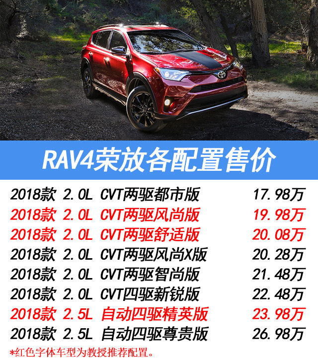 RAV4总共8个车型。精英版和尊贵版是2.5L的发动机,其他均为2.0L的发动机。