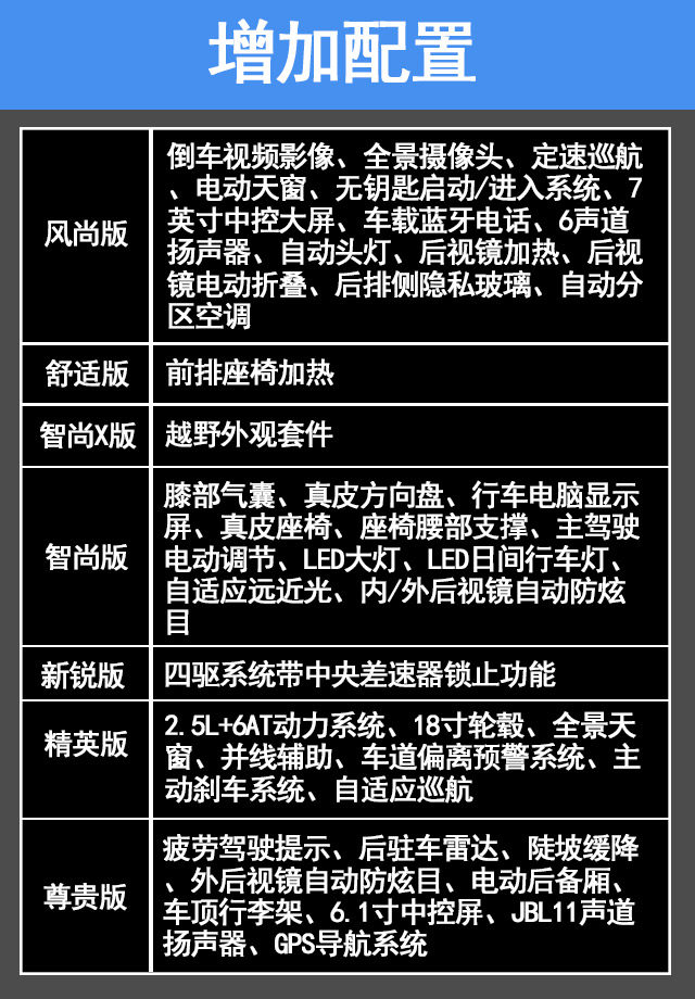 总结:从性价比来说,风尚版会比较不错。智尚版的配置虽然高,体验提升不明显,所以按需选购。2.5L的只推荐低配,高配主动安全配置太多反而影响驾驶体验。