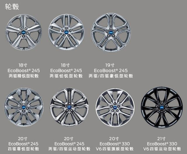 锐界只提供6款颜色可以选择,凡赛尔棕是个不错的选择。而轮毂就多了,锐界有11款车型,轮毂样式就提供了7款,竟然比车身颜色还多,而且最小都是从18寸起步,很厚道。
