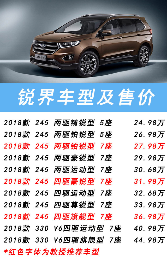 铂锐型在基础配置上加了各种实用的配置,7座版还有国人喜欢的全景天窗,7座家用也更合适,价格也是十分合理,加上优惠的话30万内可以搞定,五星推荐。而预算再多点的小伙伴就推荐上四驱豪锐型了,配置上增加LED大灯、电动后备箱、支持手机互联的SYNC® 3系统,四驱等,十分丰富,同样给五星推荐。