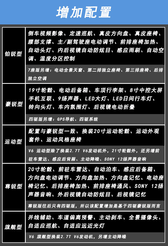 直接亮图,大都数中型SUV买家的预算都是在30万上下,所以综合考虑配置及售价后,教授推荐两驱铂锐型,四驱豪锐型,以及四驱旗舰型。