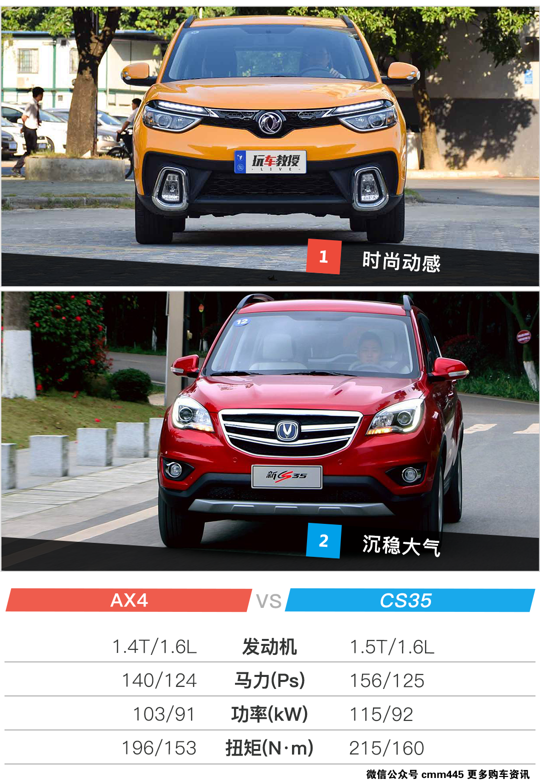 AX4与CS35在外形上已经有非常大的区别,前者适合那些喜欢时尚的年轻人,而后者则更符合那些成熟男人的喜好。动力系统上,两者都有自吸和涡轮车型可选,但是AX4的自动挡车型是用双离合变速箱,而CS35则是用传统AT变速箱,后者显然更为可靠。