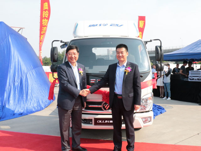 【中国物流与采购联合会副会长蔡进先生与福田轻型商用车事业本部奥铃业务总监王建军先生为福田奥铃EV纯电动轻卡揭幕】