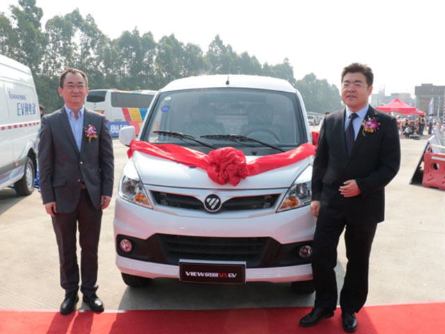 【广州市聚力供应链商会监事、凌科供应链董事长王勇先生与福田轻型商用车事业本部营销公司副总经理王明亮先生为福田风景V5纯电动物流车新品揭幕】