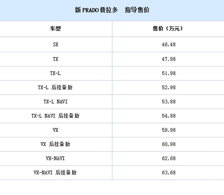 作为第四代普拉多的中期改款车型,一汽丰田新普拉多近日携10款车型正式上市,新车售价区间为46.48万-63.68万元,全系仅提供3.5L一种排量。外观上新普拉多采用全新的五辐直瀑式进气格栅设计,且格栅与前大灯组直接相连,配合下方更为粗犷的新保险杠,彰显硬派气质。车尾造型进行小幅改进,根据车型可选择外挂式备胎。全车长宽高分别为4840(带外挂备胎为5010)/1885/1890mm,轴距2790mm。