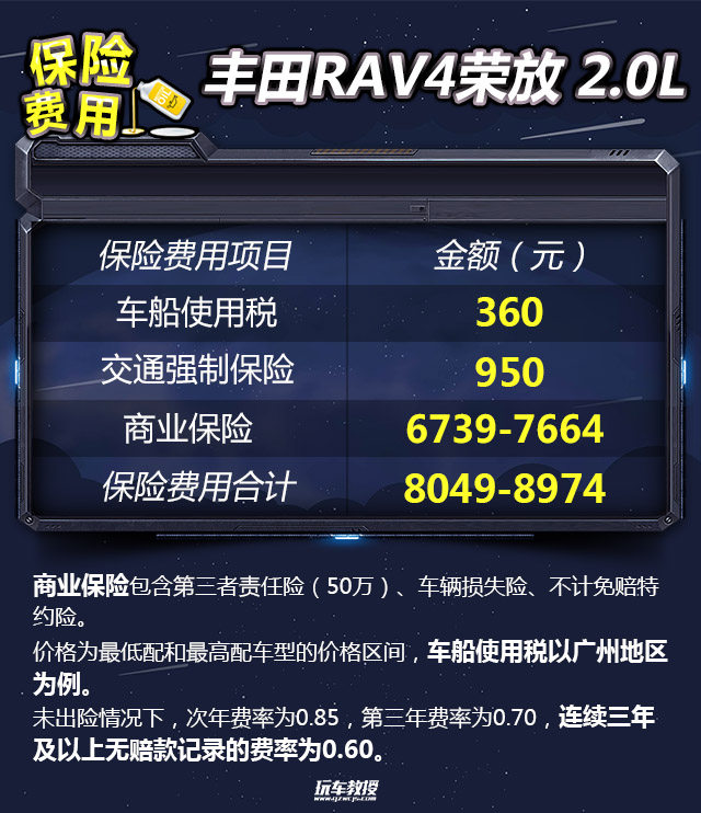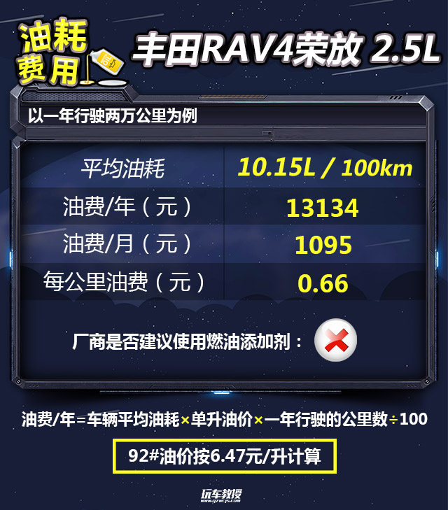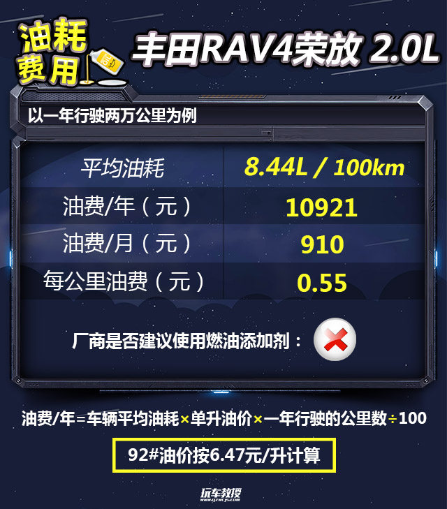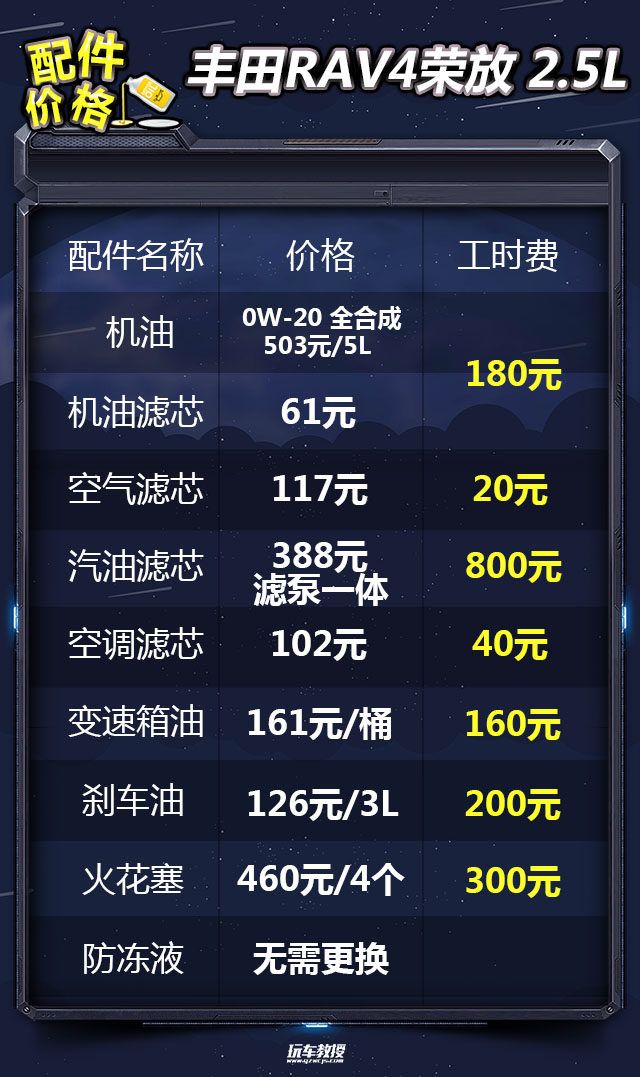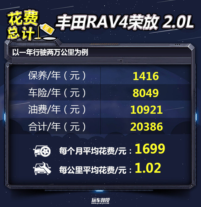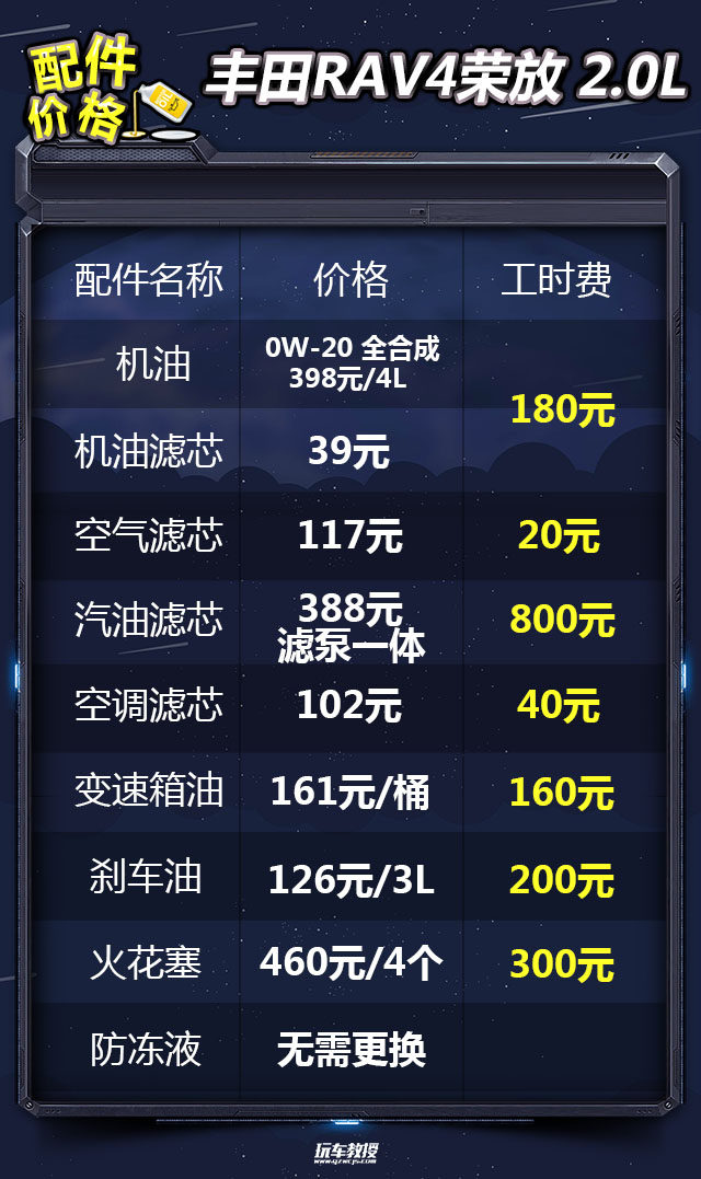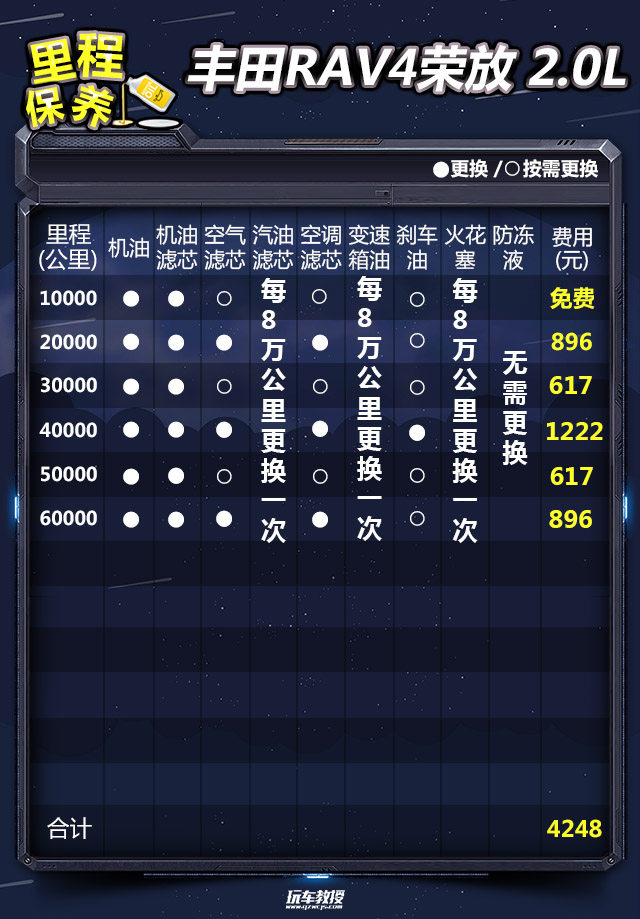 教授总结:丰田RAV4荣放一次小保养的费用分别是2.0L车型需要617元;2.5L车型需要744元,三年6万公里总保养费用分别为4248元和4883元。以最受关注的车型为例:2.0L CVT两驱都市版一年的保养费用为1416元,用车成本合计为20386元,平均每月花费1699元;2.5L 自动四驱精英版一年的保养费用为1628元,用车成本合计为24345元,平均每月花费2029元。由于排量的不同,2.5L车型的油耗稍高,保养费用也有所不同,2.0L车型显然更有性价比。