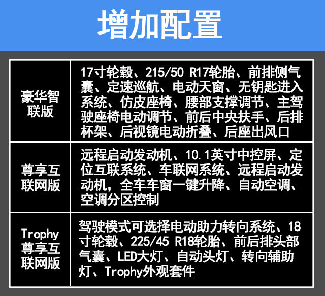 各配置新增一览。值得注意的是,目前上市的Trophy版搭载的是普通版本的1.5T,并不是那款190匹马力,300牛·米的性能版1.5T。