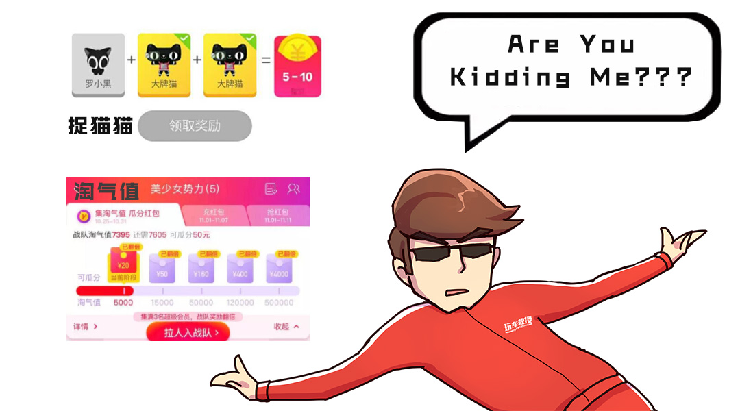 套路二:一打开某宝的网页,傻眼了。“捉猫猫、定金膨胀翻倍、群战队、淘气值……“各种让人看不懂的词语层出不穷,敢情是考大家的言语理解?