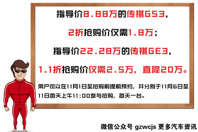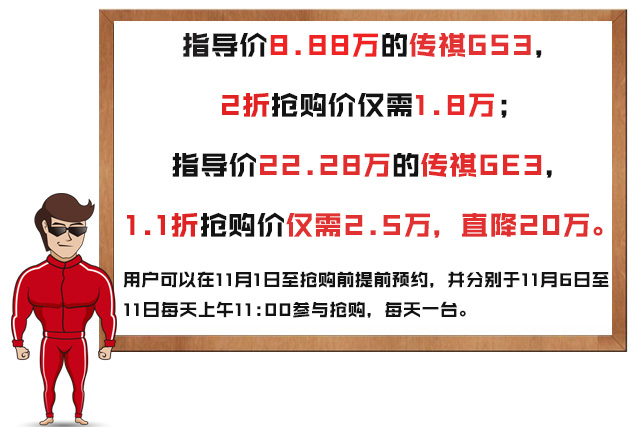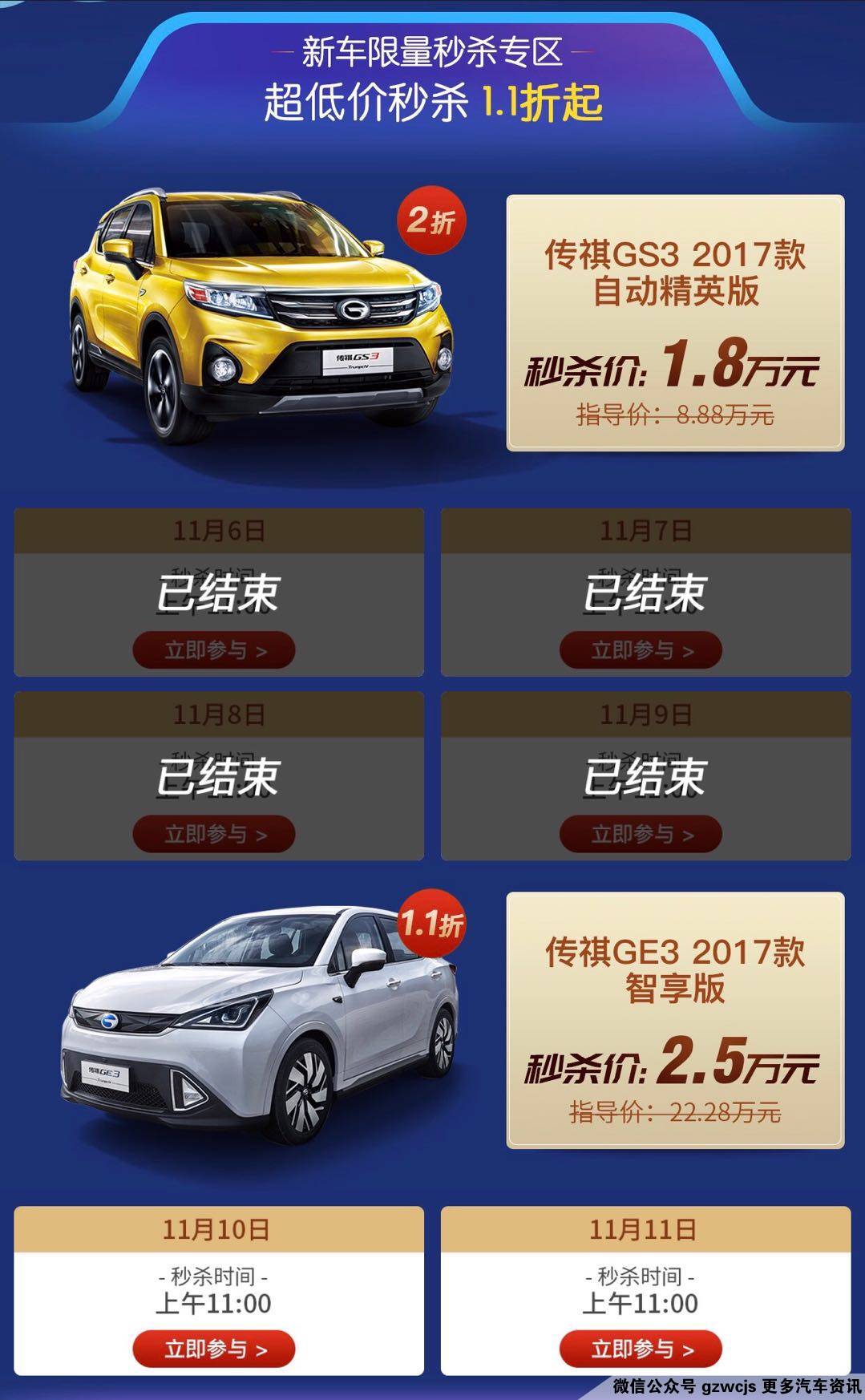 别再一直追着教授问,买什么车最实惠?去哪里买车最划算?就在大圣车服商城,本次双十一新车抢购活动中设置了4台传祺GS3及2台传祺GE3参与活动。不管是传祺GE3可省20万,还是传祺GS3仅需1.8万,反正优惠力度大到让人难以置信。
