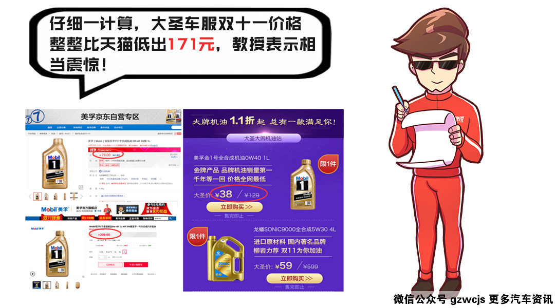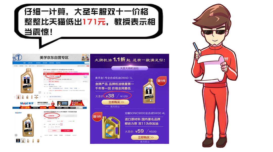 不少车主们都等着双十一给爱车囤货,但很多时候“不比不知道,一比吓一跳”。同样的牌子、同样的容量,价格却可以差很多。如:1L装美孚金1号全合成机油在天猫旗舰店售价高达209元,在京东自营店售价79元,在大圣车服商城售价低至38元。