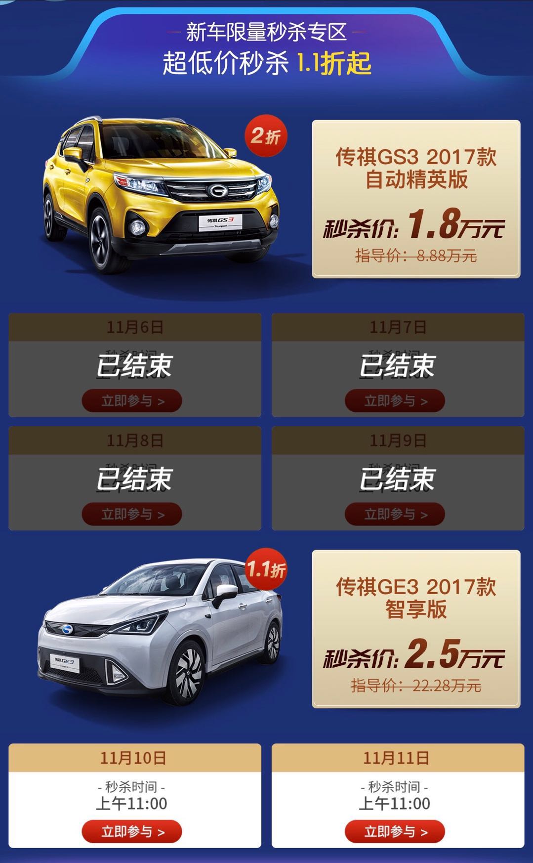 照这么算,每台传祺GE3大圣车服需要补贴用户近20万,两台则是40万;而每台传祺GS3需要补贴用户7万元,四台则要补贴近30万。相较于其他的汽车电商平台力度是大了不少。目前已经被秒了四台传祺GS3,教授祝大家好运,把剩下的两台也给秒了。