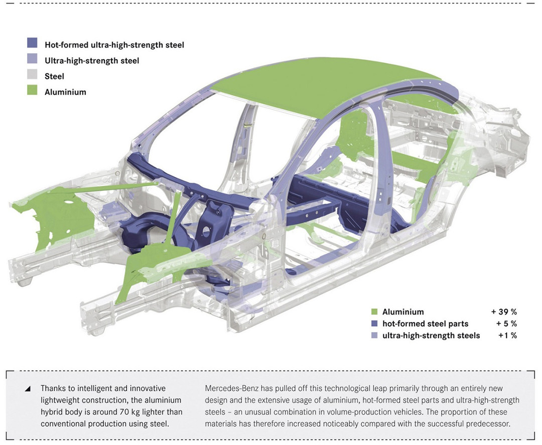虽然作为一般民用车基于成本和工艺等原因,它们不能大量使用碳纤维材料,但现在奔驰已经大量使用铝合金和高强度钢作为搭建车体的主要材料。使用更轻、更坚固的材料配合更佳的工程力学设计,可以让车身更轻,以及提升动力水平和操控能力。而更坚固的车体也能获得更佳的碰撞安全性,同时燃油经济性也可以进一步提高。